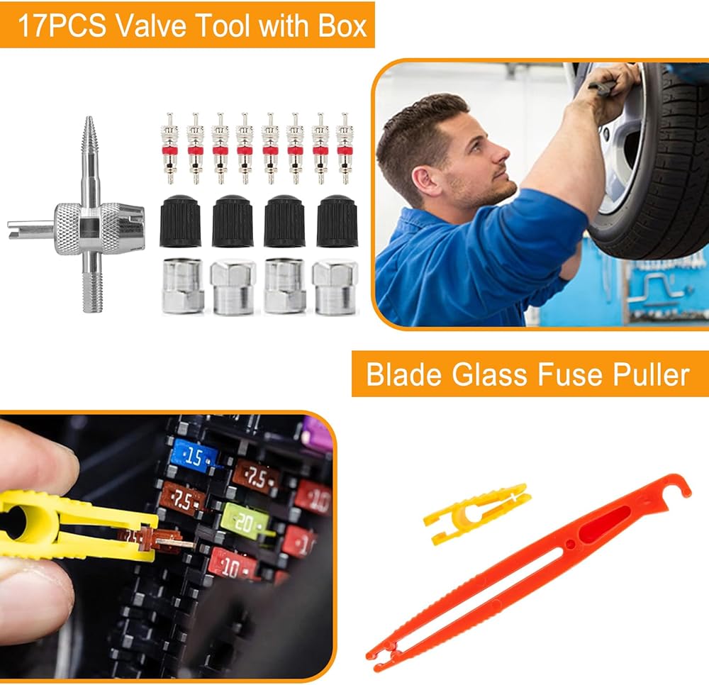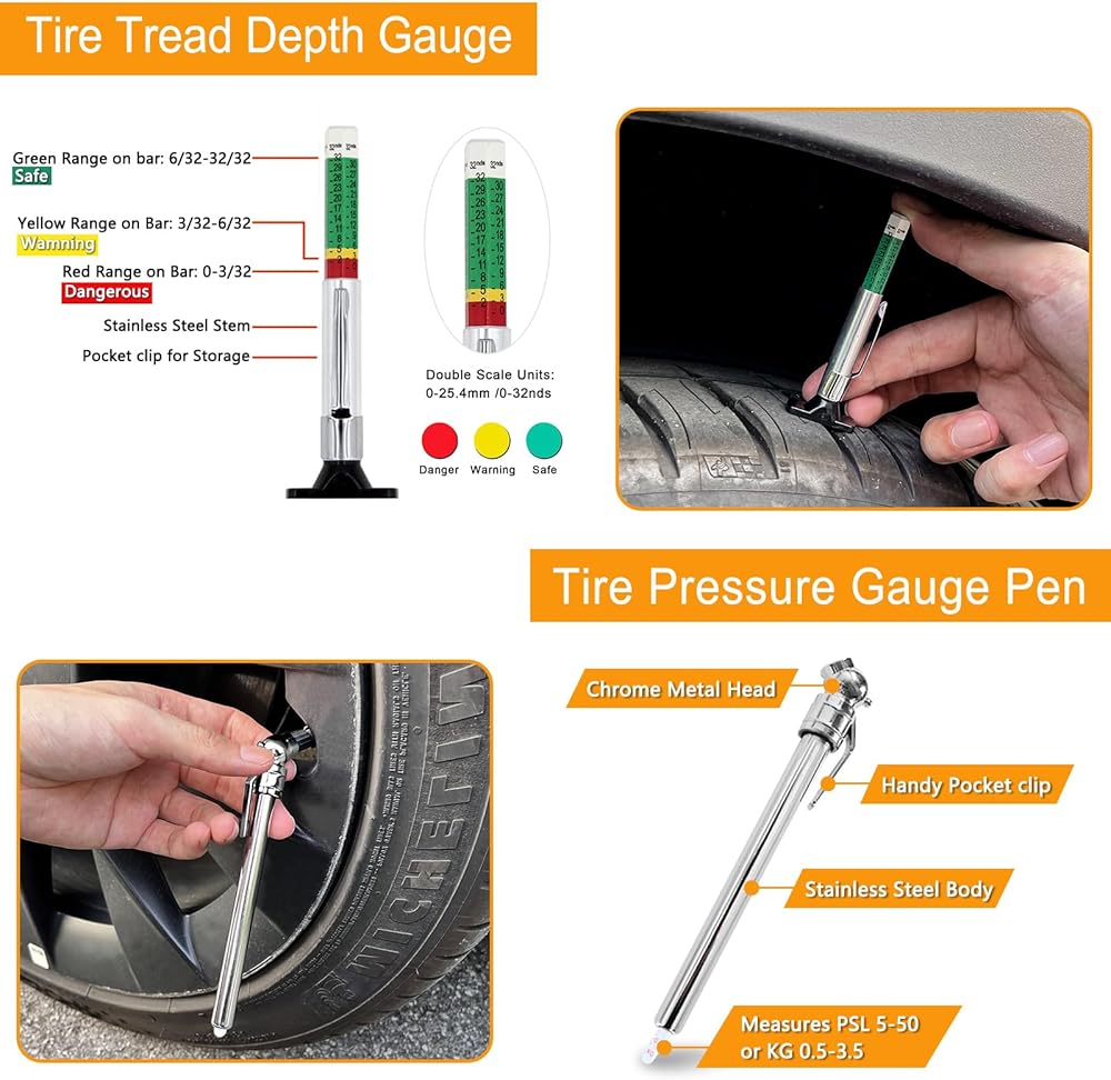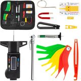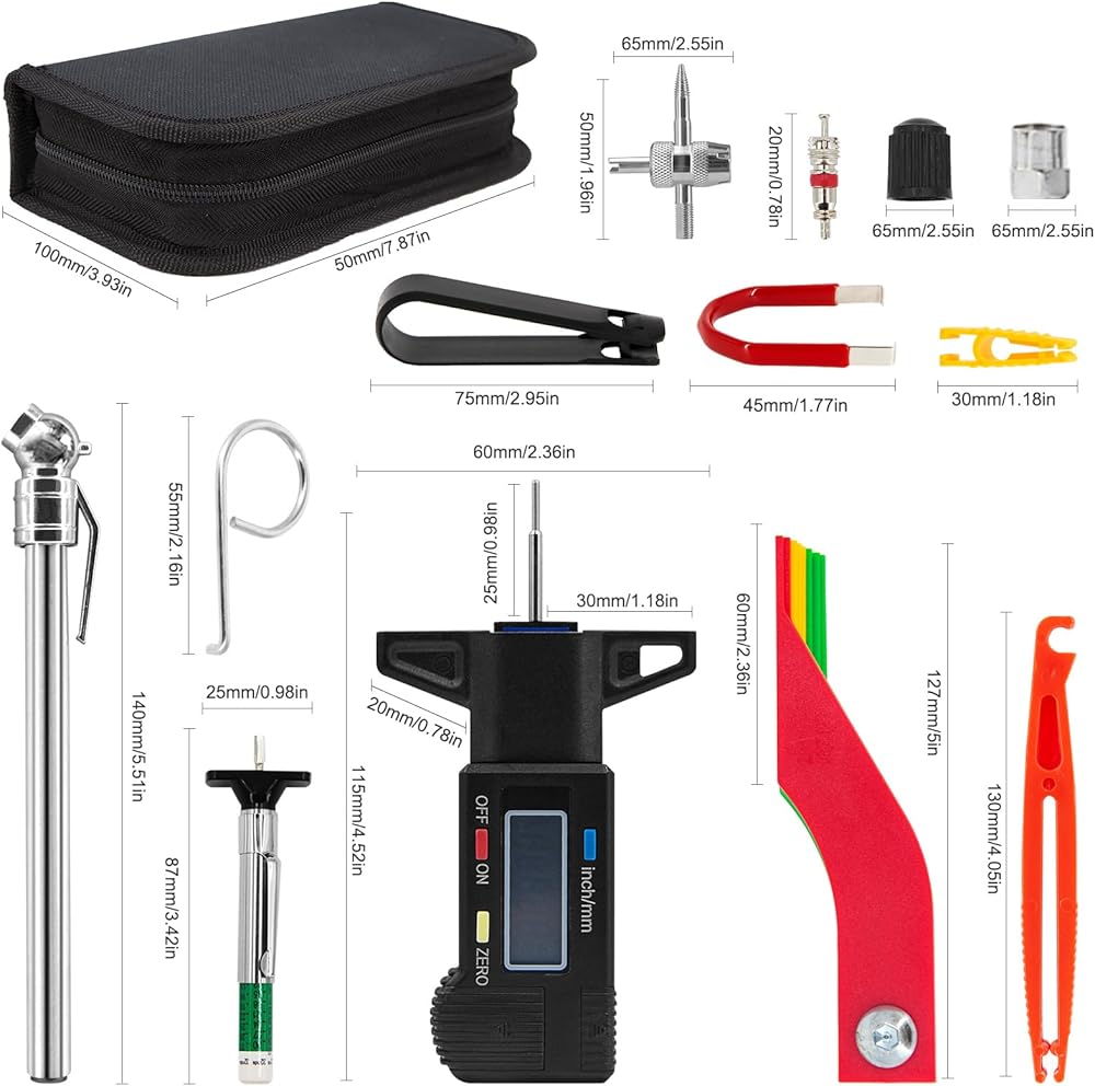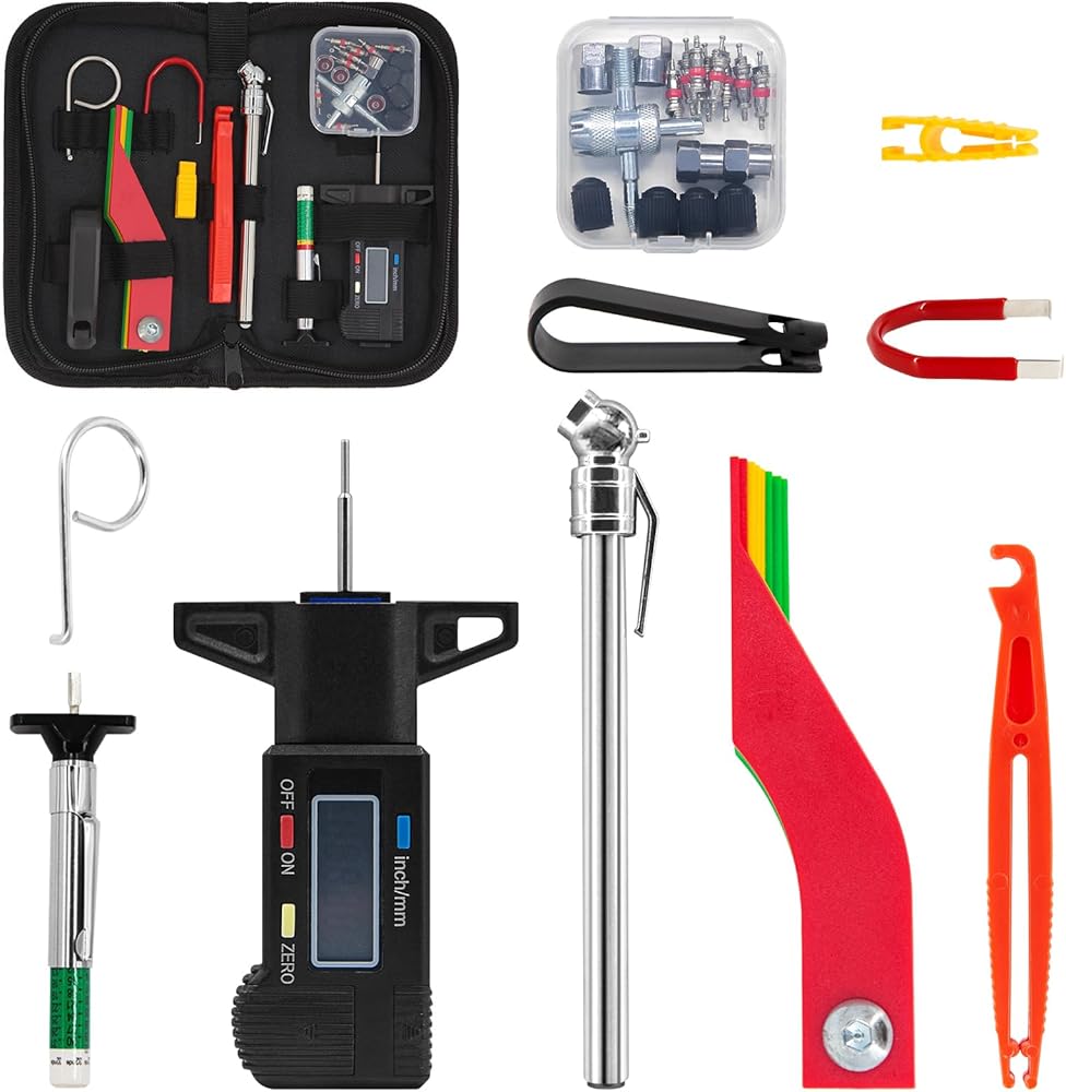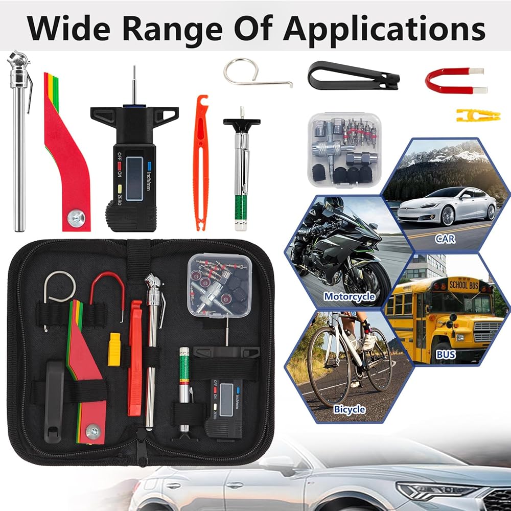 مجموعة متنوعة من أدوات قياس عمق مداس الإطارات ومقاييس الفرامل، قياس سمك بطانة الفرامل، قلم رقمي لقياس ضغط الإطارات، أغطية مسامير العجلة، خطافات سحب، سحّابات صمامات زجاجية مع حافظة