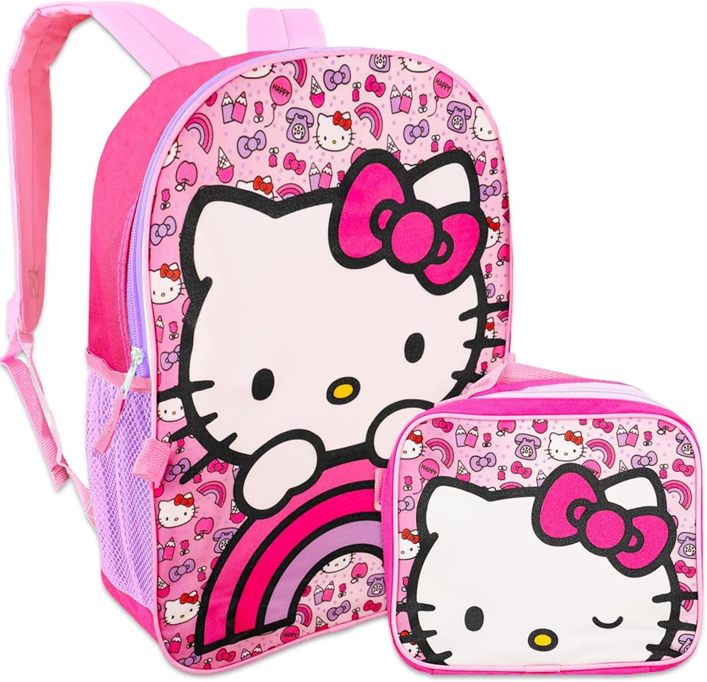 حقيبة ظهر كيتي مع حقيبة غداء للفتيات والأطفال ~ حزمة من 5 قطع مع حقيبة مدرسية مقاس 16 بوصة، وأكثر من 2000 ملصق، ومشابك للصفحات، والمزيد (مستلزمات المدرسة هالو كيتي)