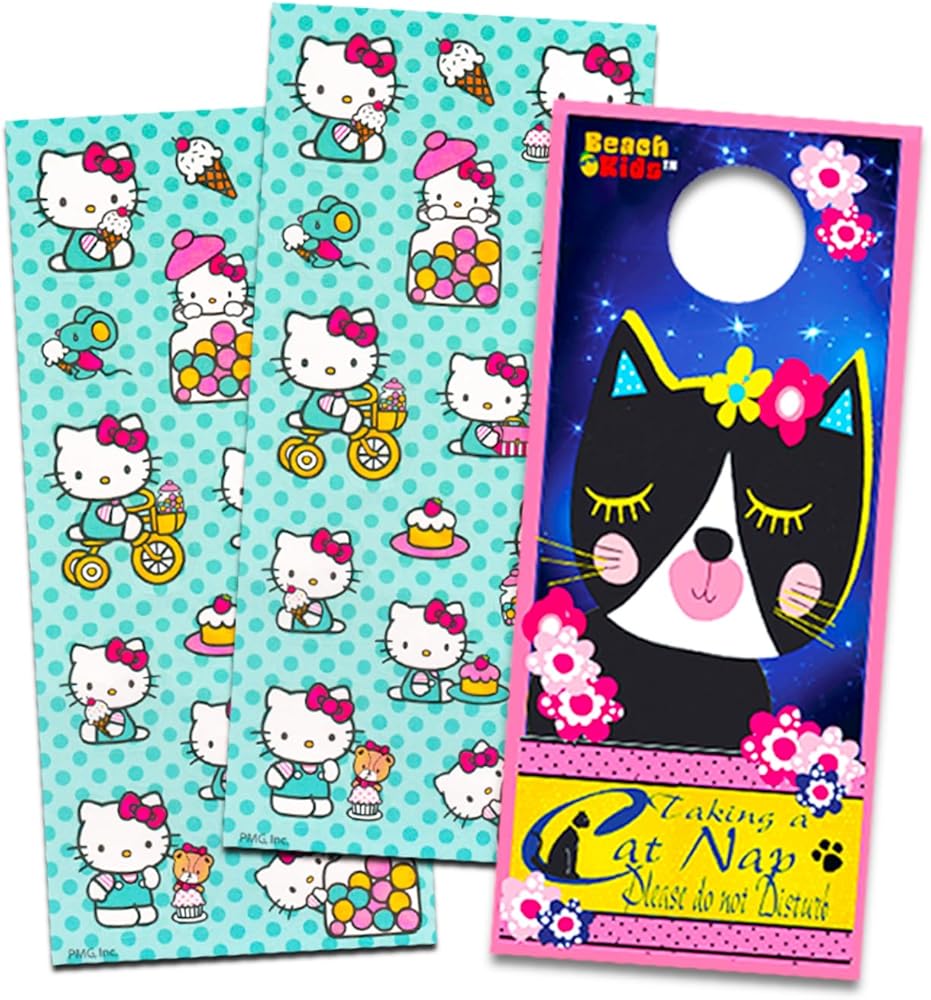 لوازم مدرسية سانريو هالو كيتي مرخصة رسميًا. تأتي مجموعة حقيبة الظهر المدرسية هالو كيتي أيضًا مع ملصقات هالو كيتي الإضافية وشماعة باب للقطط من بيتش كيدز!