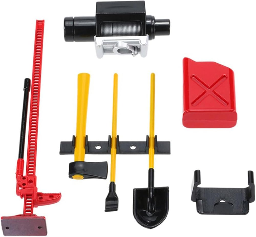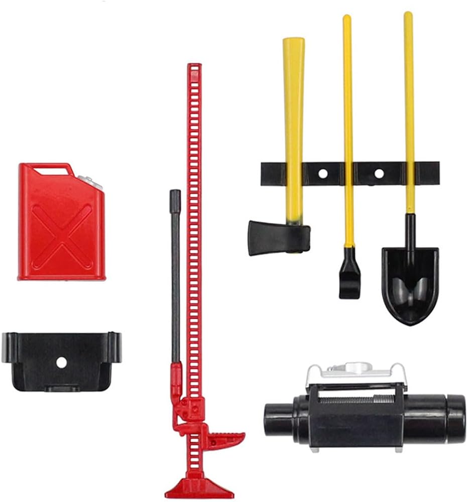 - مجموعة أدوات تزيين RC: تشمل علبة الغاز، والونش، والمقبس، والمجرفة، والفأس، وقضيب النقب