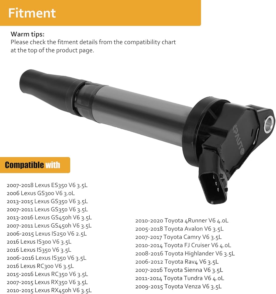 [تناسب المركبات] - حزمة ملف الإشعال تناسب V6 3.5L: 2007-2017 Toyota Camry، 2006-2012 Toyota Rav4، 2007-2016 Toyota Sienna، 2009-2015 Toyota Venza، 2005-2018 Toyota Avalon