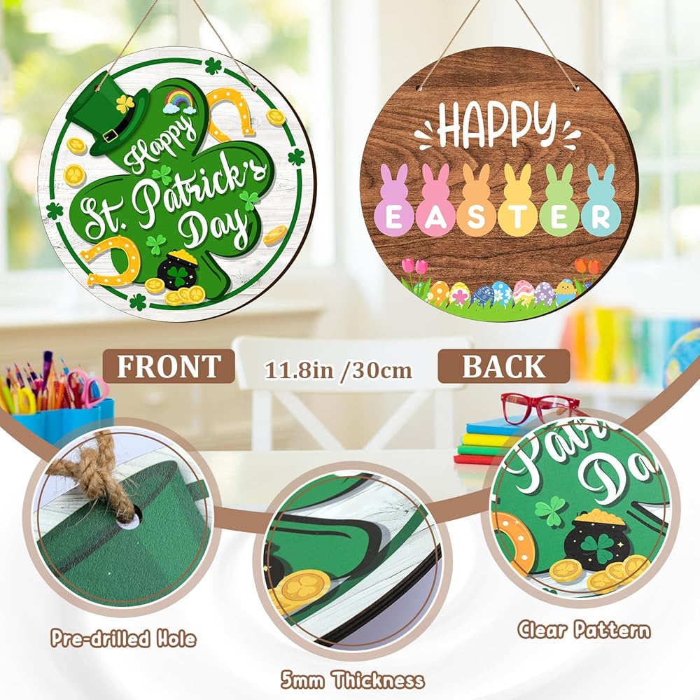 غرض عملي مزدوج: يمكنك الانتقال بسهولة من عيد القديس باتريك إلى عيد الفصح مع علامتنا الخشبية ذات الوجهين. قم بتدوير إكليل الإكليل الخشبي الريفي للكشف عن أقوال العطلات الكلاسيكية، وLuck Clover Shamrock، وBunny Rabbit، والبيض - مثالية لتزيين باب المزرعة الأمامي دون كسر البنك