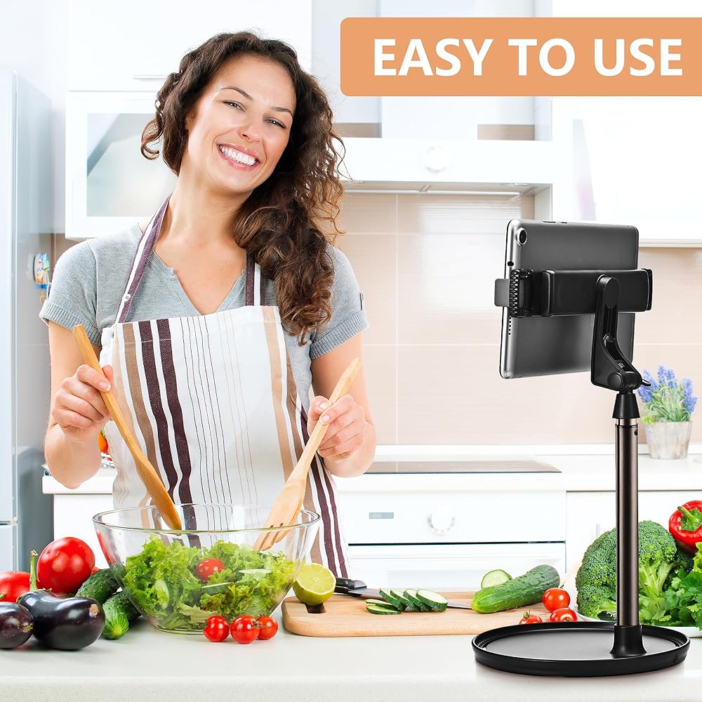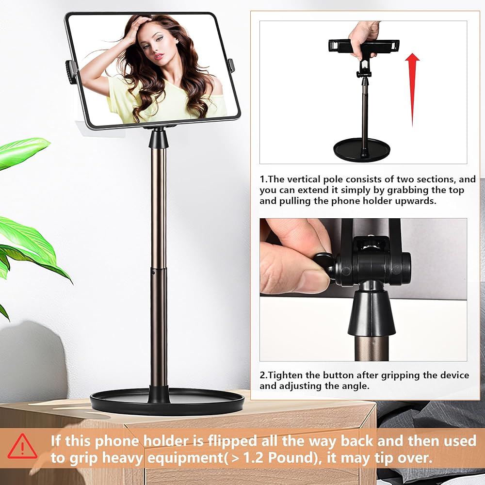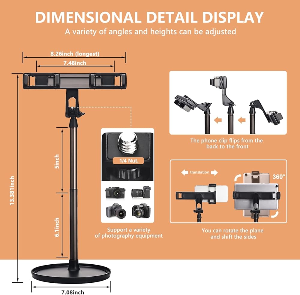 【زاوية ارتفاع قابلة للتعديل】يمكن تمديد حامل الهاتف بزاوية الارتفاع القابل للتعديل لأعلى لضبط الارتفاع وفقًا لاحتياجاتك الخاصة، يسارًا أو يمينًا لضبط العرض، ويمكن أيضًا تدوير حامل iPad 360 درجة لضبط الزاوية، ولكن تذكر أن تشديد الزر لقفل الزاوية.