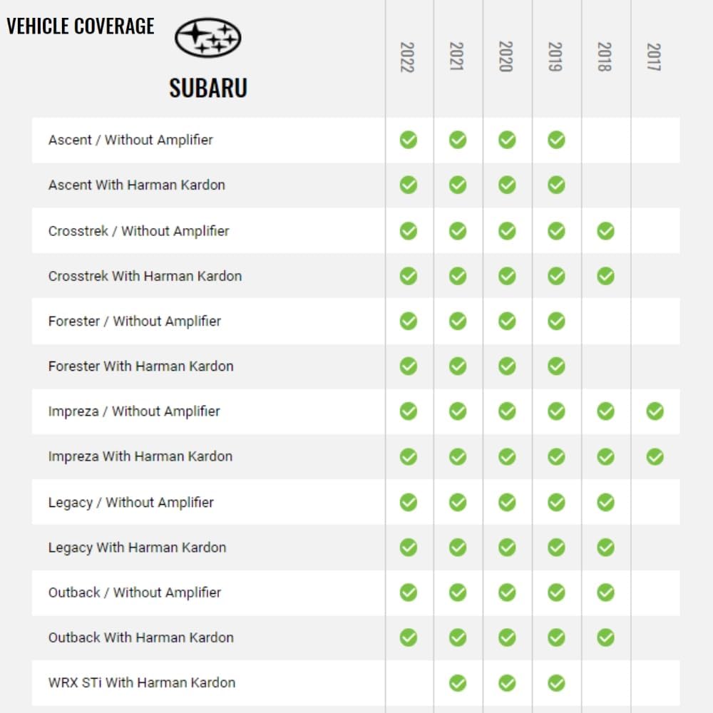 - يحتفظ بمضخم Starlink الخاص بـ Subaru، ومضخم Harman Kardon (بما في ذلك الخافت)، والكاميرا الاحتياطية ومساعد الركن، ومدخل aux