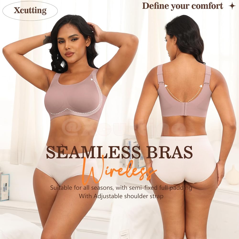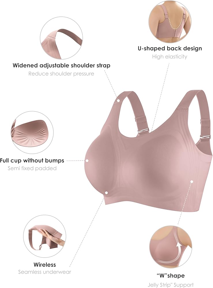【حمالة صدر قابلة للتعديل بتصميم على شكل حرف U】تصميم حمالة الصدر على شكل حرف U بدون خياطة ومريح يتميز بنفاذية هواء جيدة، ونسيج ناعم يمكن أن يبقيك منتعشًا طوال اليوم. يمكن تعديل الحزام عالي التمدد ليناسب النساء من مختلف أشكال الجسم من العادي إلى حجم كبير، مما يوفر دعمًا أفضل ويقلل الضغط على الكتفين والرقبة.