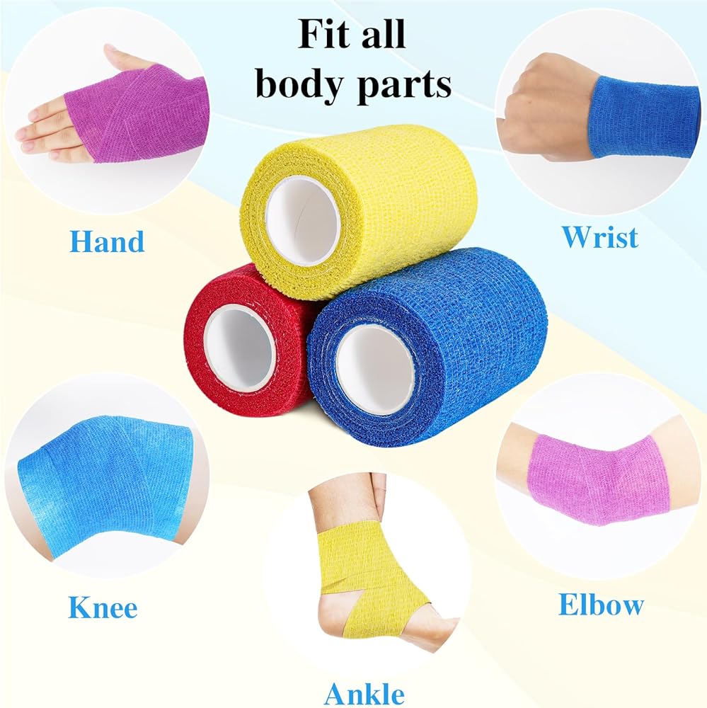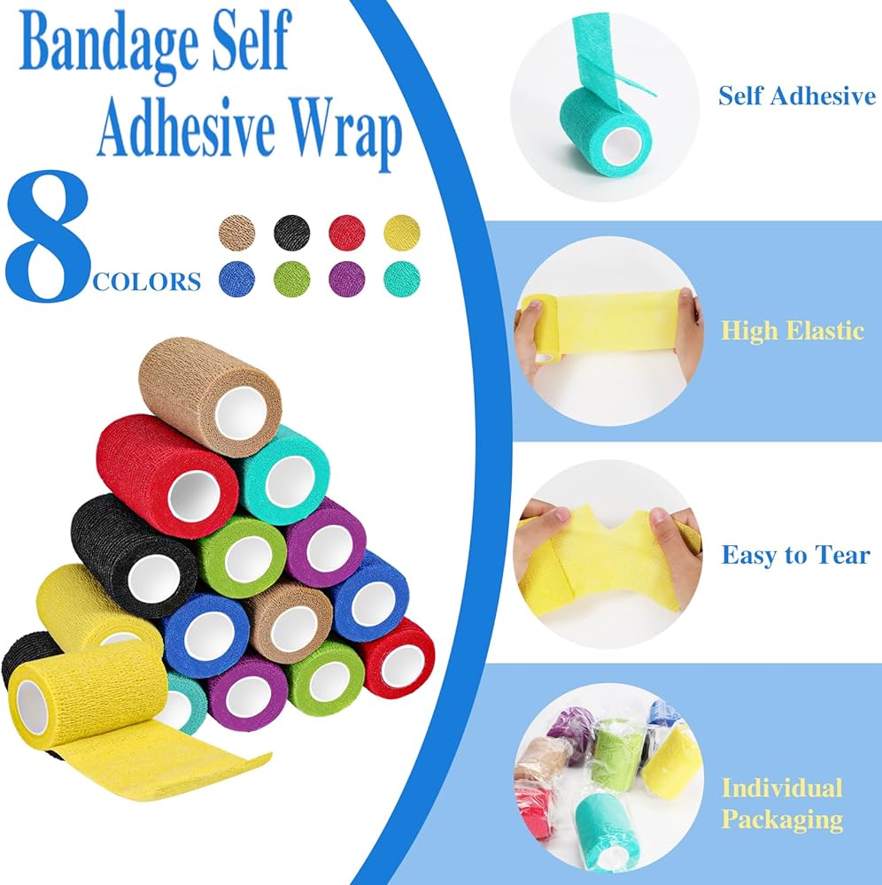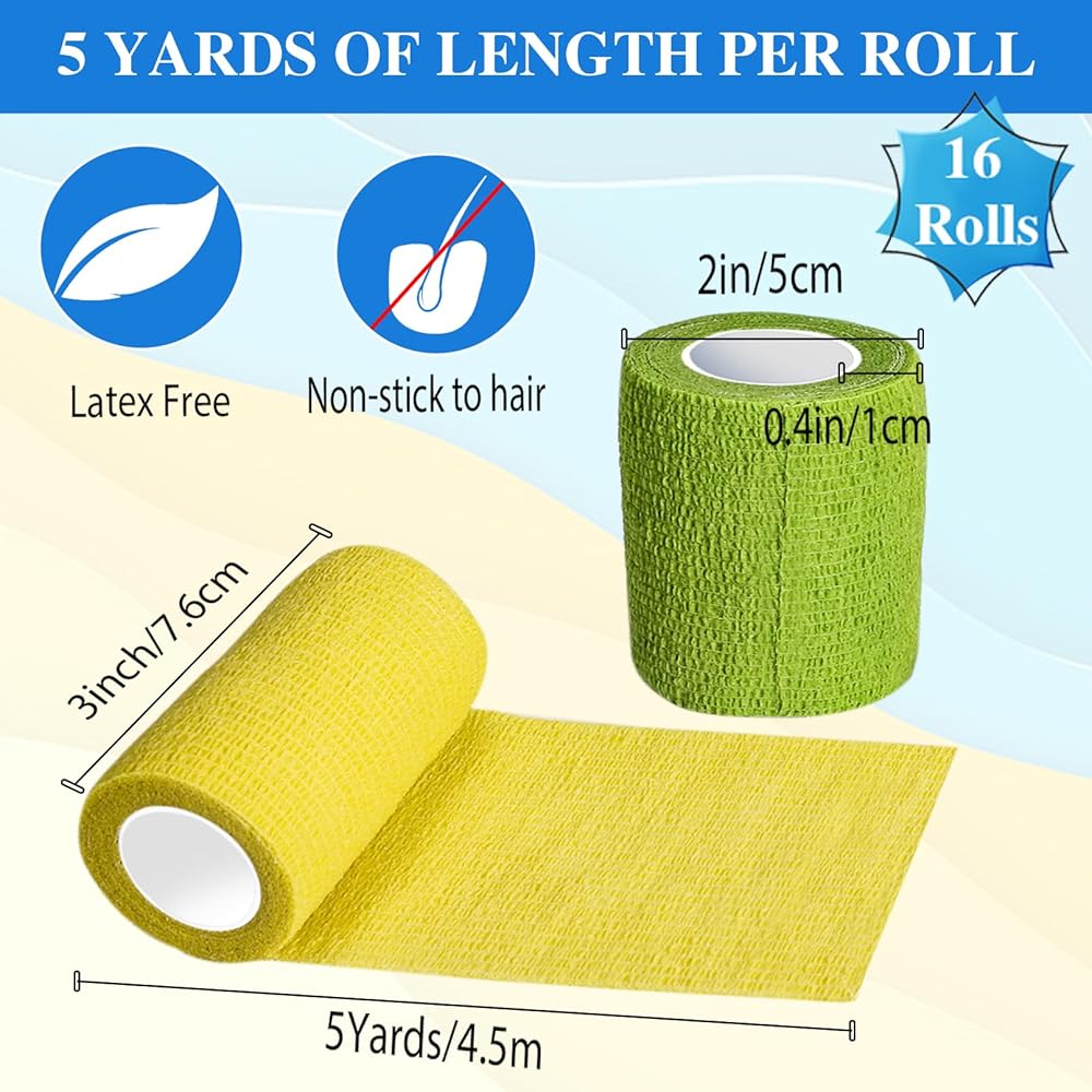 🙂16 لفة ملونة: تحتوي عبوتنا على 16 لفة ضمادة ذاتية اللصق. كل لفة ضمادة ملفوفة بشكل فردي بأبعاد 3 بوصة × 5 ياردات. تحتوي على 8 ألوان، كل لون يحتوي على لفتين، ألوان مختلفة تناسب اختياراتك المتنوعة.