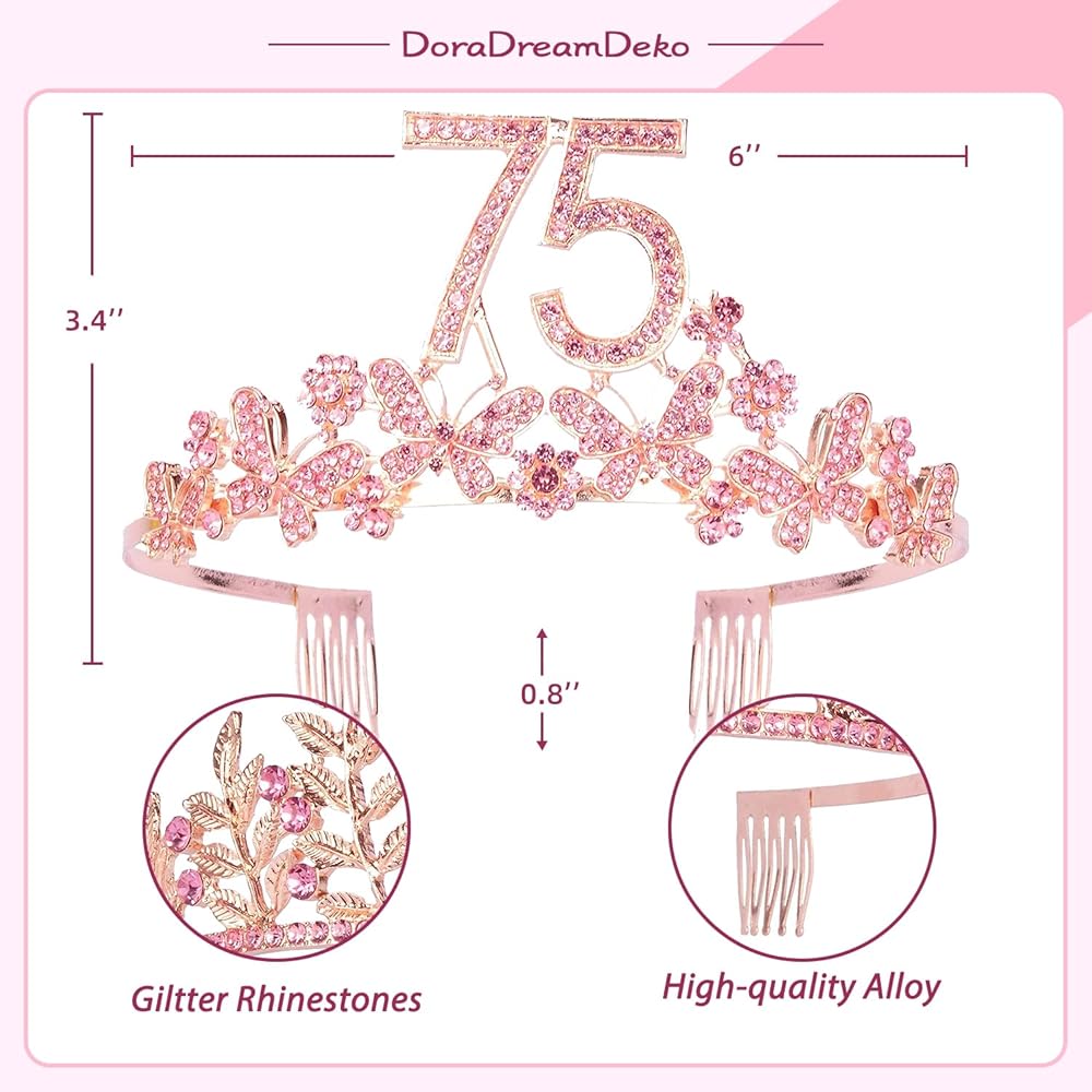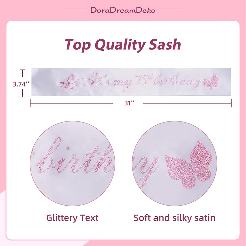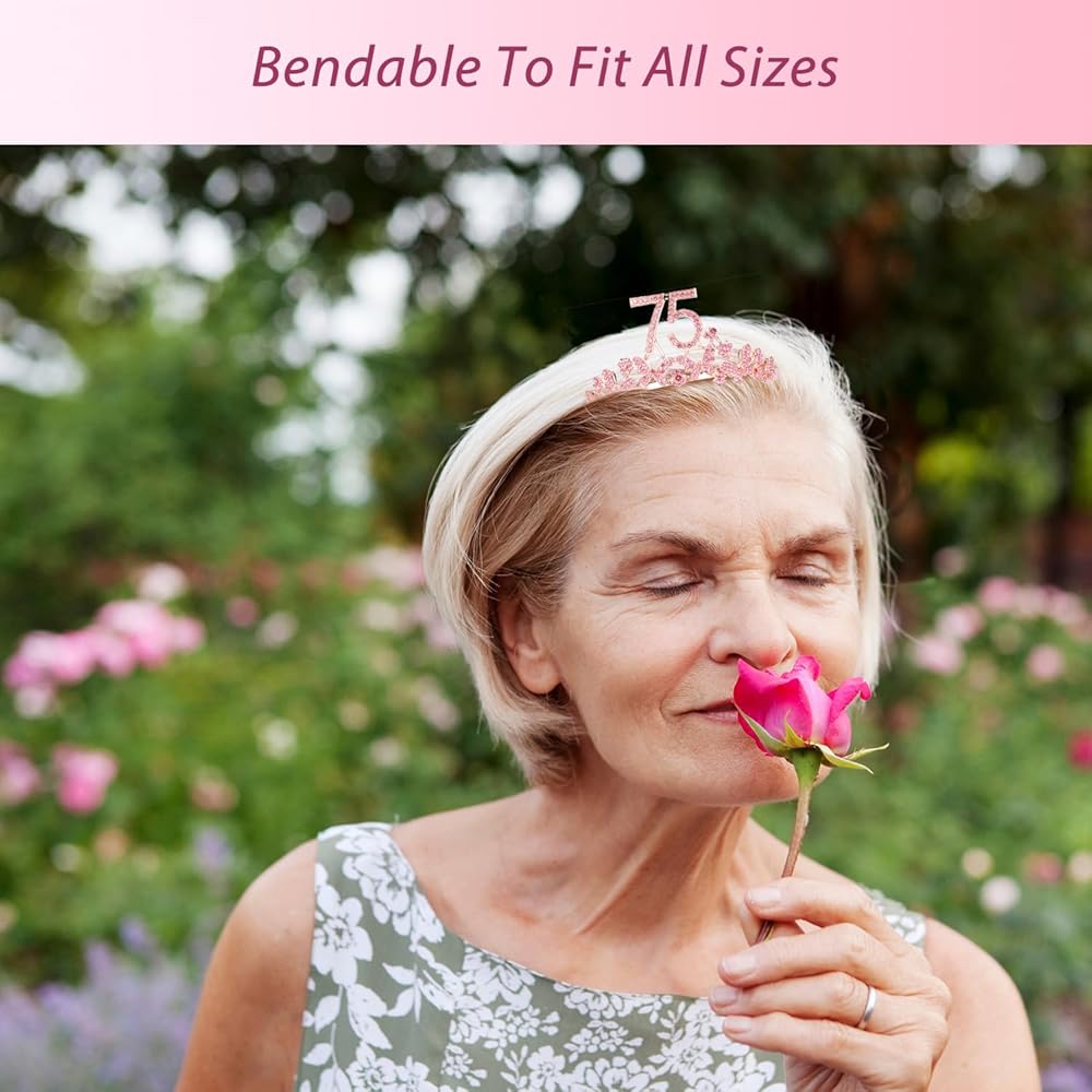 إكسسوارات جميلة وأنيقة لحفلة عيد ميلاد مثالية - تحتوي على: تاج فضي لزينة عيد الميلاد الخامس والسبعين ووشاح عيد ميلاد باللونين الوردي والأبيض مع "75 ورائع"