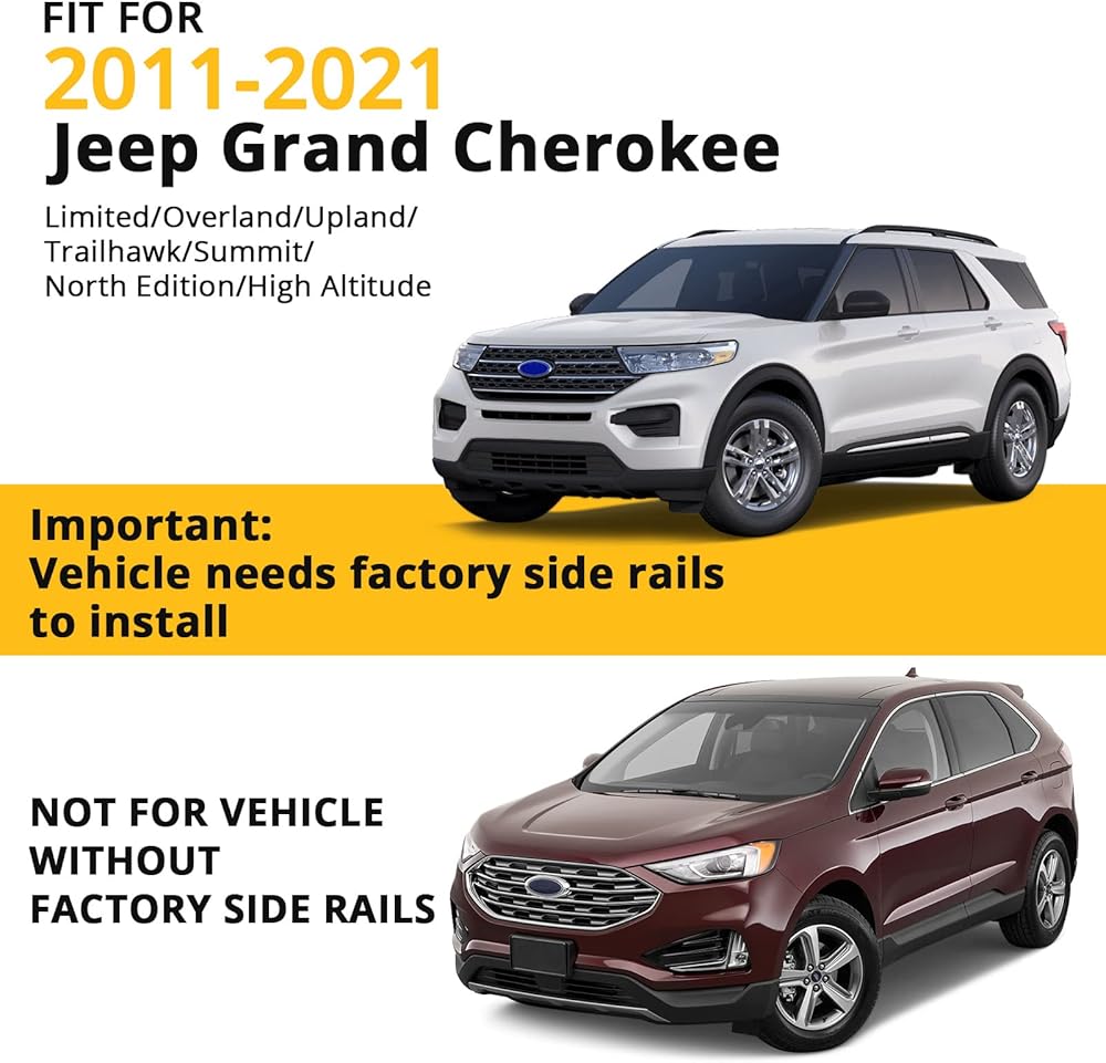 قطعتان من القضبان المتقاطعة لرف السقف لعام 2011-2021 جراند شيروكي مع قضبان جانبية مخددة، واستبدال قضيب السيارة من الألومنيوم لحقيبة حمل البضائع على السطح، وقوارب الكاياك، والدراجة، ولوح التزلج على الجليد وما إلى ذلك