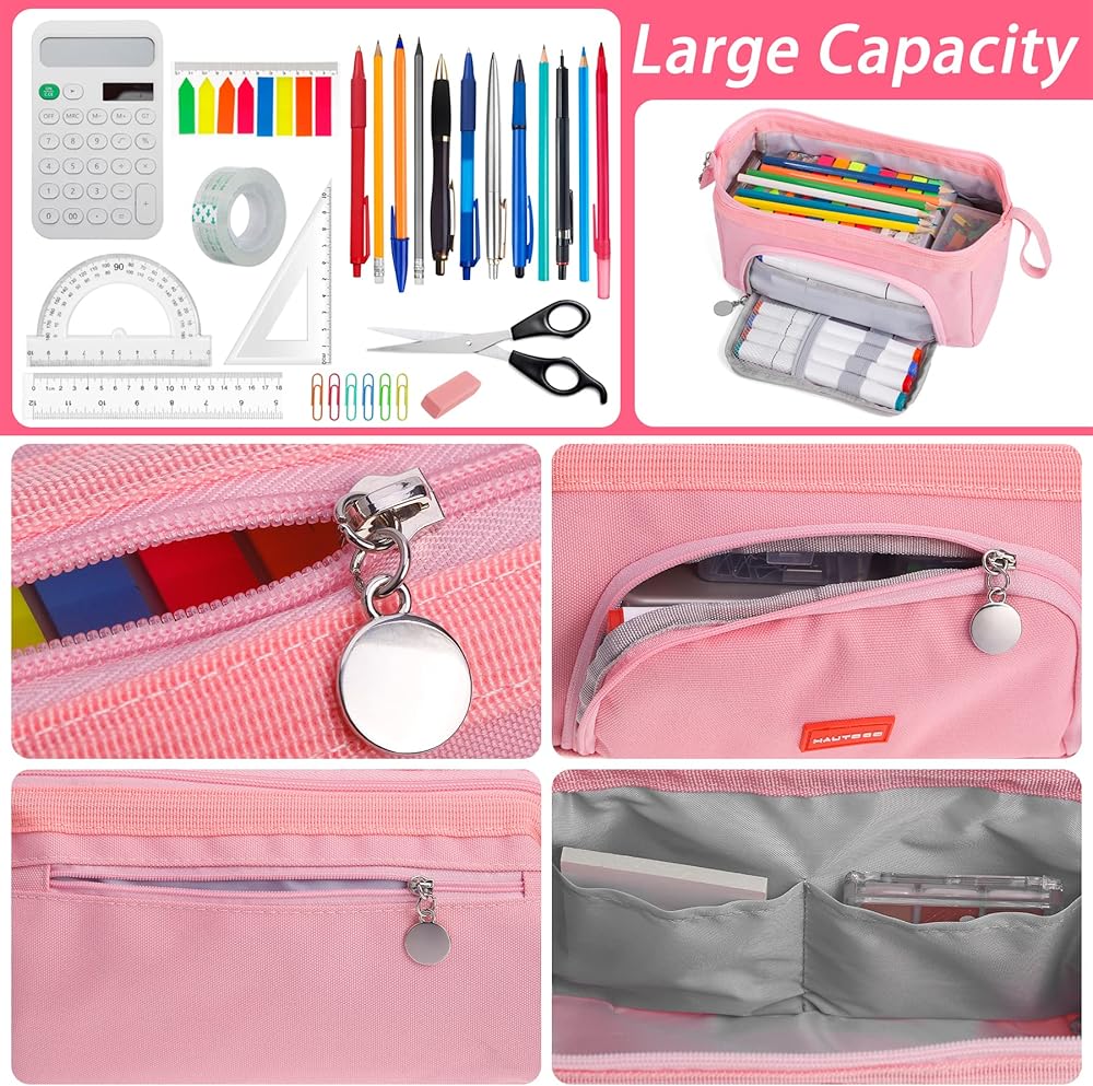 حقيبة أقلام رصاص ذات سعة كبيرة من HAUTOCO، حقيبة تخزين كبيرة من القماش الكتاني، حقيبة القلم المحمولة، حقيبة مكياج جمالية، حقيبة قرطاسية، صندوق منظم مكتب للمدرسة، مكتب المدرسة، فتاة مراهقة، وردي