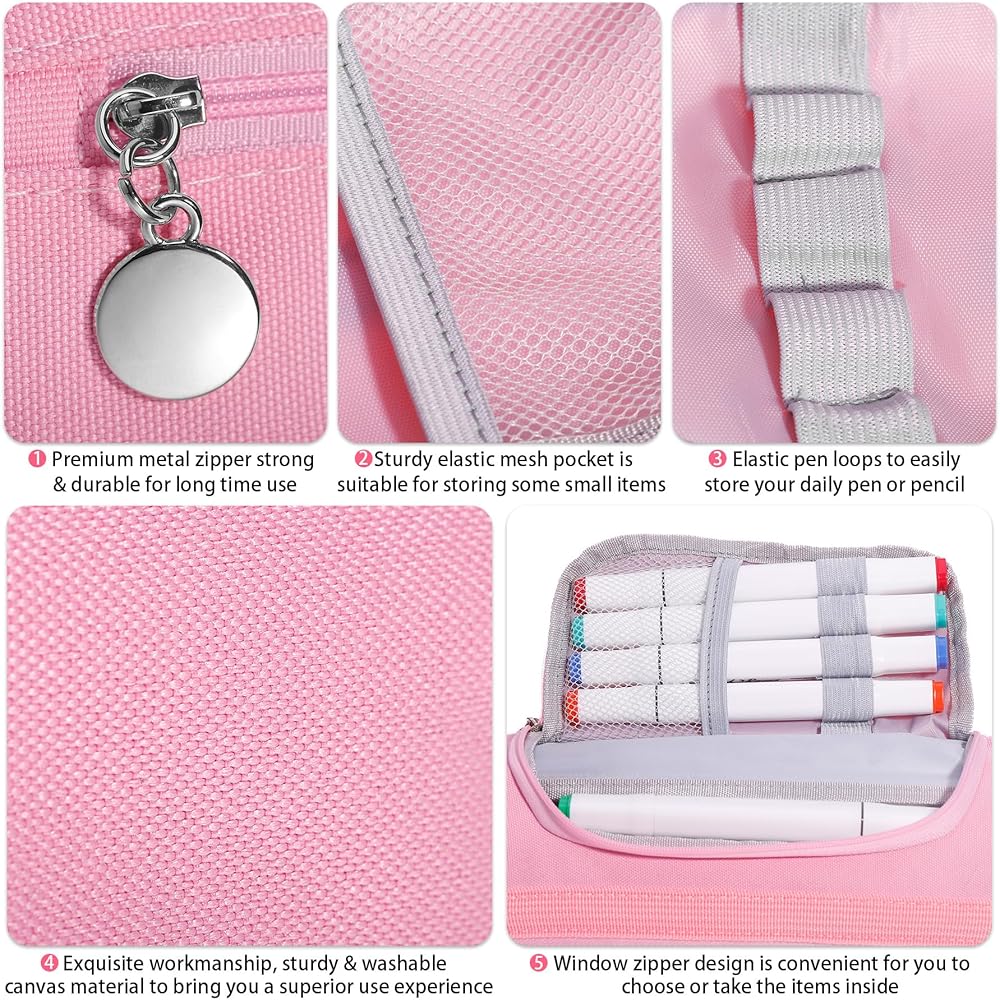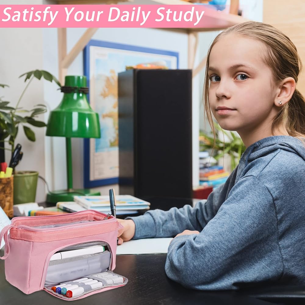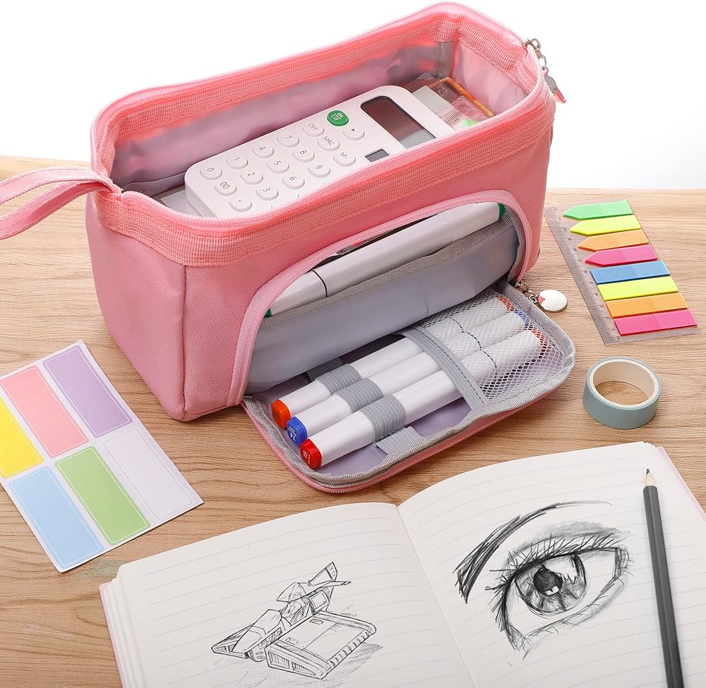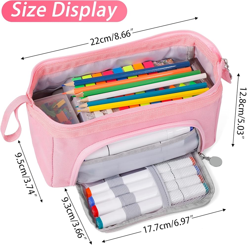 سعة كبيرة: يبلغ مقاس حقيبة القلم الرصاص هذه حوالي 10.5 × 6 × 4 بوصة وتحتوي على مساحة تخزين داخلية كبيرة جدًا؛ يمكن للحجرة الرئيسية استيعاب ما يصل إلى 100 قلم أو قلم رصاص، ويمكنها أيضًا تخزين المقص أو القواعد أو الملاحظات اللاصقة أو علامات التبويب الفهرس أو الممحاة أو الشريط أو المساطر أو الدباسات أو الآلات الحاسبة الصغيرة