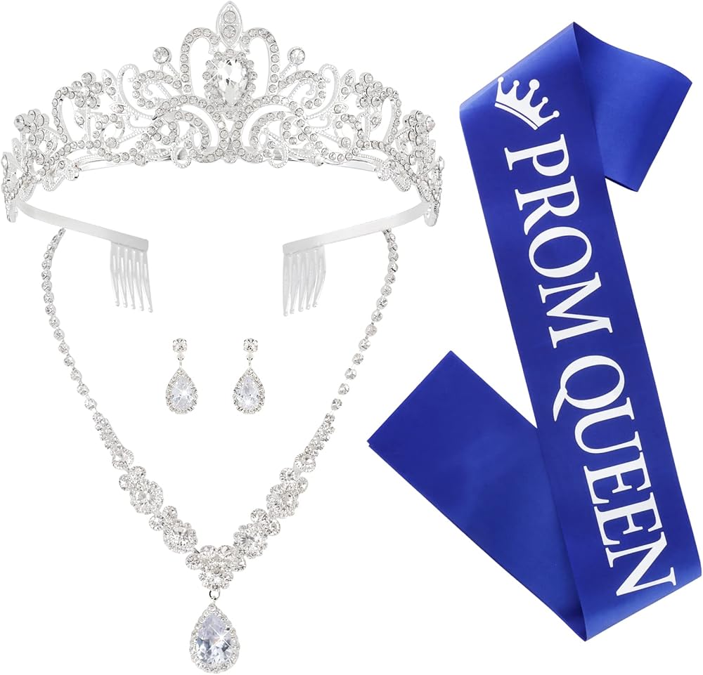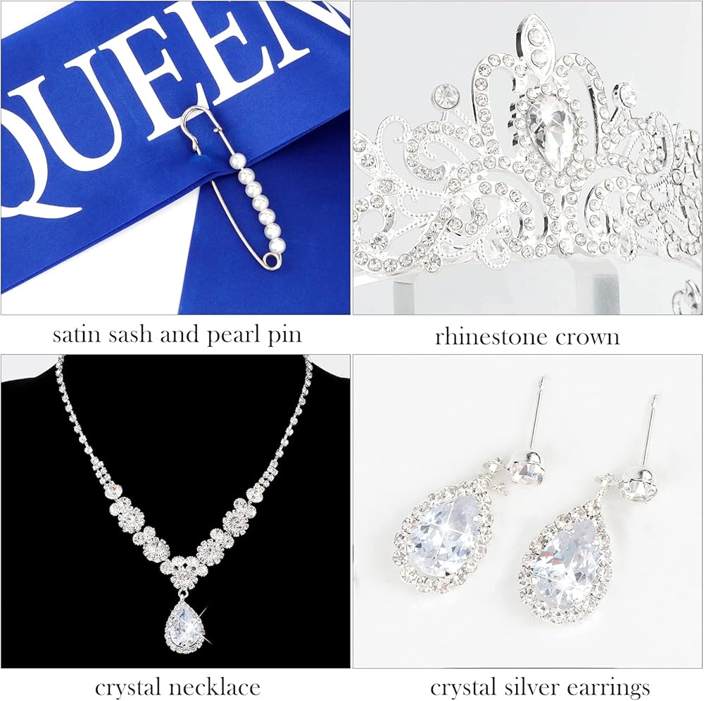 تشمل العبوة: تاج من حجر الراين، وقلادة كريستال، وأقراط فضية كريستالية، ووشاح "ملكة الحفلة الراقصة" من الساتان ودبوس لؤلؤي