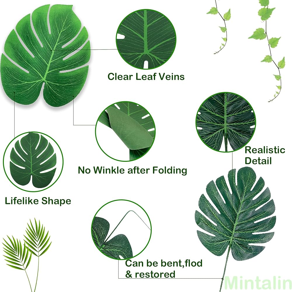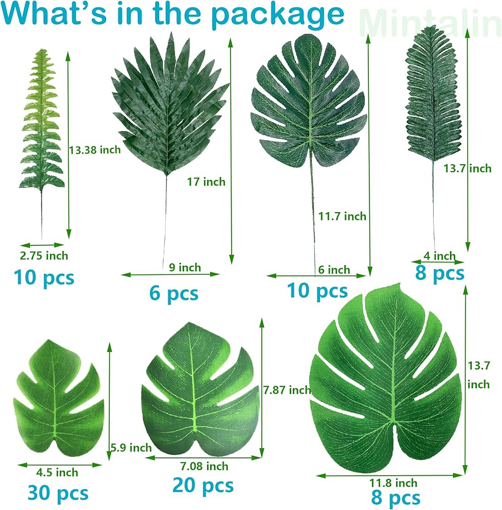 🧩🧩 محتويات العبوة - مجموعة أوراق النخيل المكونة من 92 قطعة من مينتالين تتضمن 30 × أوراق مونستيرا صغيرة، 20 × أوراق مونستيرا متوسطة، 8 × أوراق مونستيرا كبيرة، 10 × أوراق سرخس بوسطن، 10 × أوراق مونستيرا مع سيقان، 6 × أوراق نخيل أريكا، 8 × أوراق من نبات الساجو مع السيقان. أحجام مختلفة وأوراق النباتات الاستوائية المختلفة سوف تلبي معظم احتياجات ديكور الحفلات ذات الطابع الاستوائي.