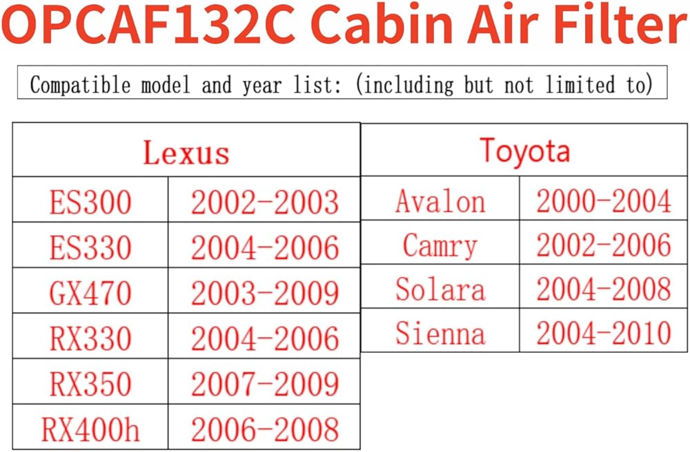 فلتر هواء المقصورة OPCAF132C متوافق مع أفالون/كامري/سولارا/سيينا/RX350/RX400h/ES330/GX470، بديل لـ CP132، CF10132،87139-06030