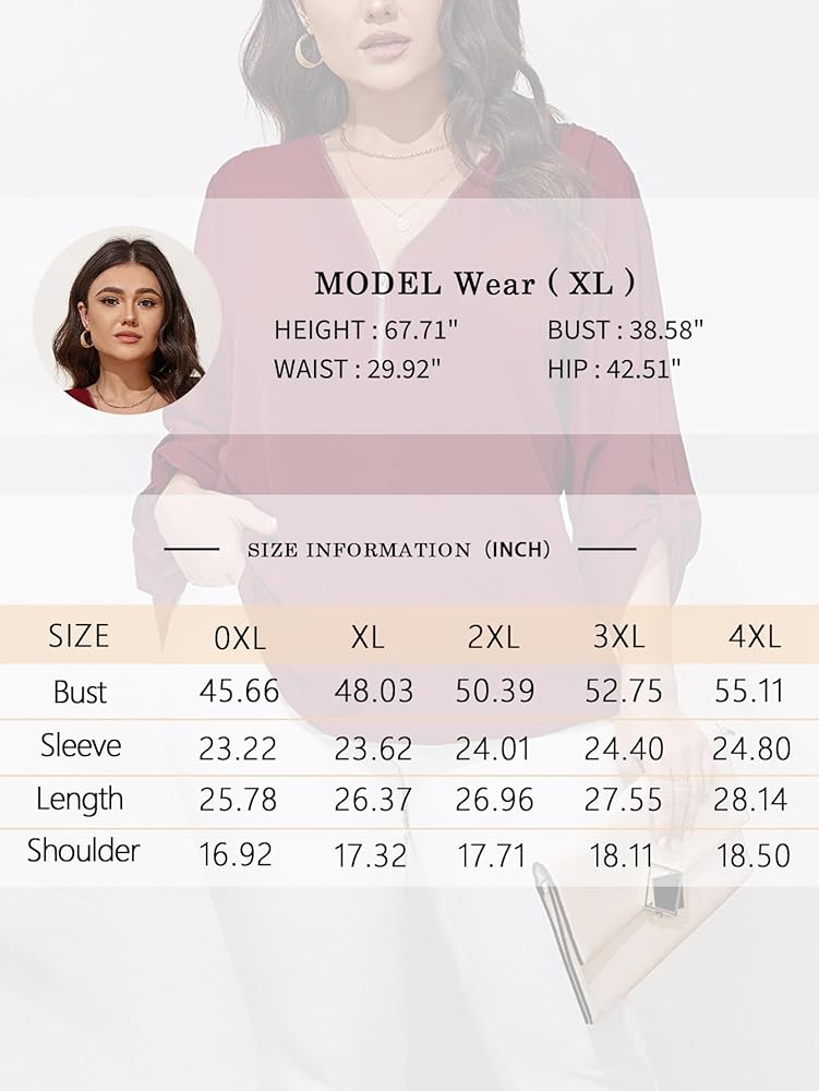 المقاس: XL(US16-18)، 2XL(US18-20)، 3XL(US22-24)، 4XL(US26). يمكن غسل السترة العلوية للسيدات ذات الحجم الكبير في الغسالة بالماء البارد، ويوصى بها، لا تستخدم المبيضات، لا تقم بالكي أو التعليق أو التعليق لتجف. يرجى الرجوع إلى جدول المقاسات قبل الطلب