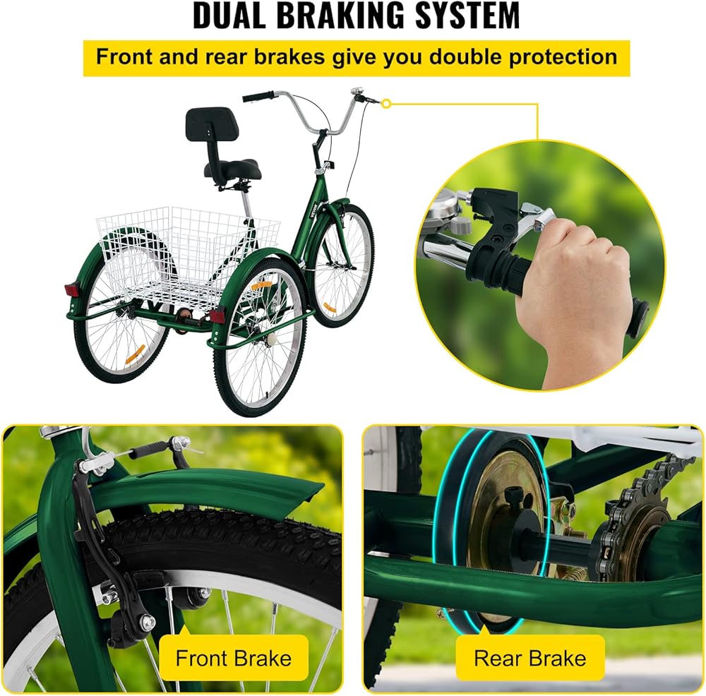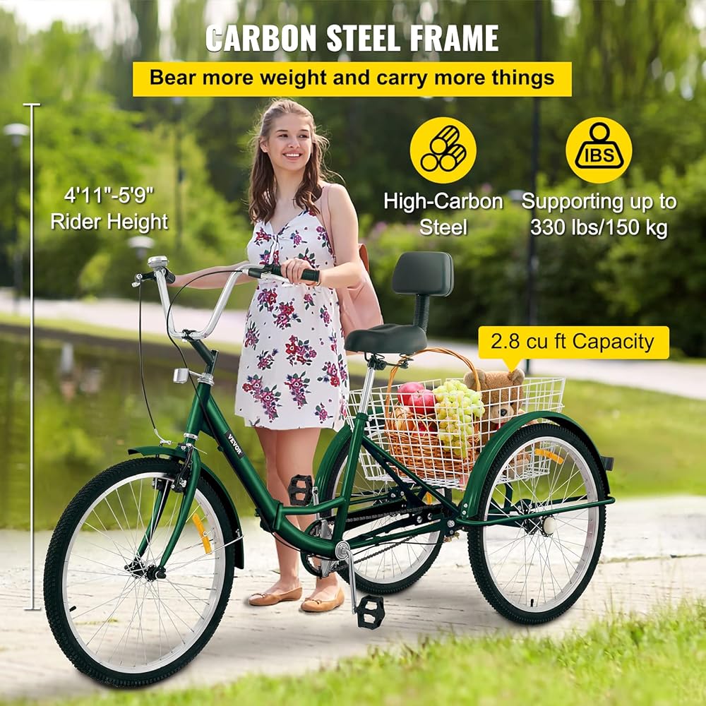 إطار فولاذي كربوني قوي: الدراجة ثلاثية العجلات القابلة للطي للبالغين مصنوعة من فولاذ عالي الكربون لتحقيق الثبات والمتانة. يدعم هذا الإطار المتين الوزن المشترك للراكب والحمولة، حتى 330 رطلاً/150 كجم. بالإضافة إلى ذلك، توفر العجلات مقاس 24 بوصة/61 سم تجربة قيادة مريحة للأشخاص الذين يتراوح طولهم بين 4 أقدام و11 بوصة/150 سم و5 أقدام و9 بوصات/175 سم.