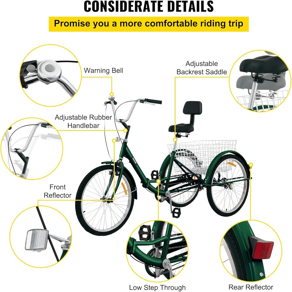 صُنعت خصيصًا لك: كل تفاصيل هذه الدراجة ذات الثلاث عجلات موجهة نحو راحتك وراحتك. يمكن تعديل ارتفاع المقاود المطاطية والسرج المبطن الناعم مع مسند الظهر للترحيب بالركاب من جميع الأحجام. الخطوة المنخفضة تجعل من السهل ركوب الدراجة ثلاثية العجلات. تضمن العاكسات والجرس أمانك أثناء الركوب ليلاً.