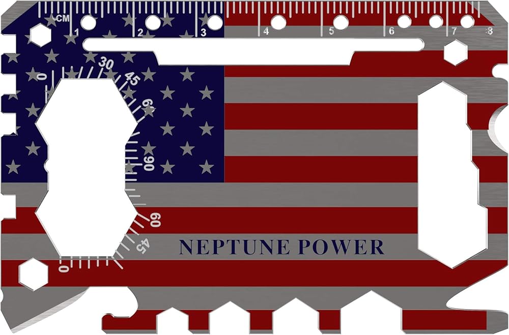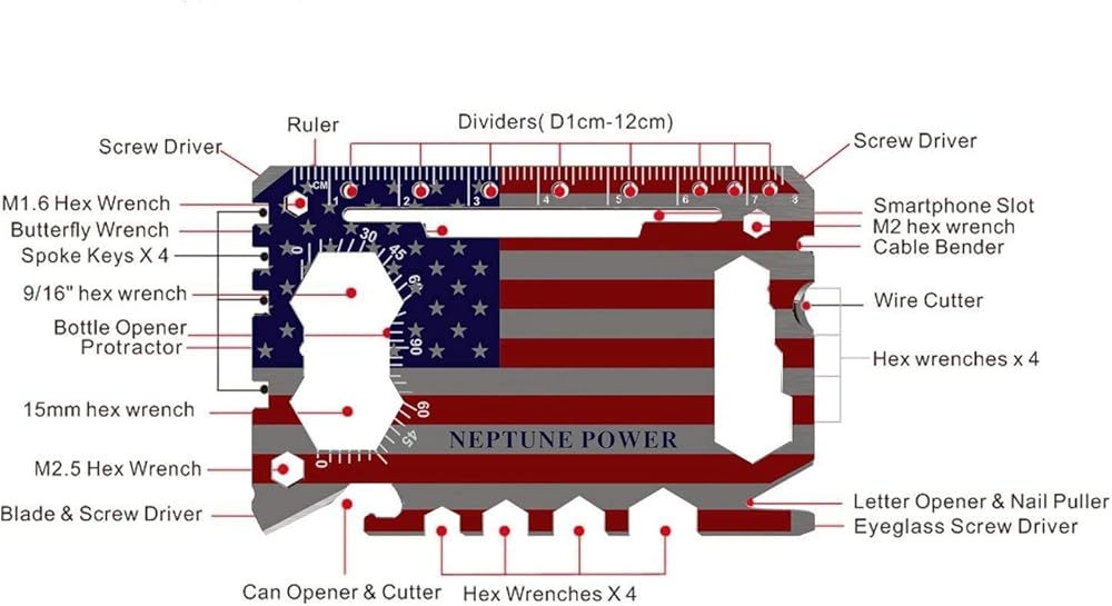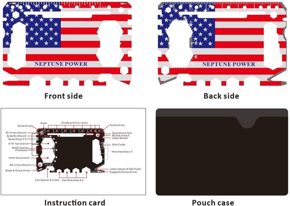 أداة بطاقات 46 في 1 - الأداة المتعددة لبطاقات الائتمان نبتون مصنوعة من الفولاذ المقاوم للصدأ وتوفر وظائف حقيقية من خلال أداة متعددة 46 في 1 معبأة في حجم بطاقة الائتمان، مما يسمح لها بالعمل كفتاحة زجاجات، وحامل هاتف. ، مفك البراغي، مفتاح الفراشة، فتاحة الصناديق، مفك النظارات، مفتاح ربط سداسي، مفتاح تكلم الدراجة، مسطرة (بوصة وسم)، مجتذب أظافر، فتاحة رسائل، فتاحة علب، قطاعة أسلاك، حامل سماعة الأذن، مقشرة فواكه وشفرة!