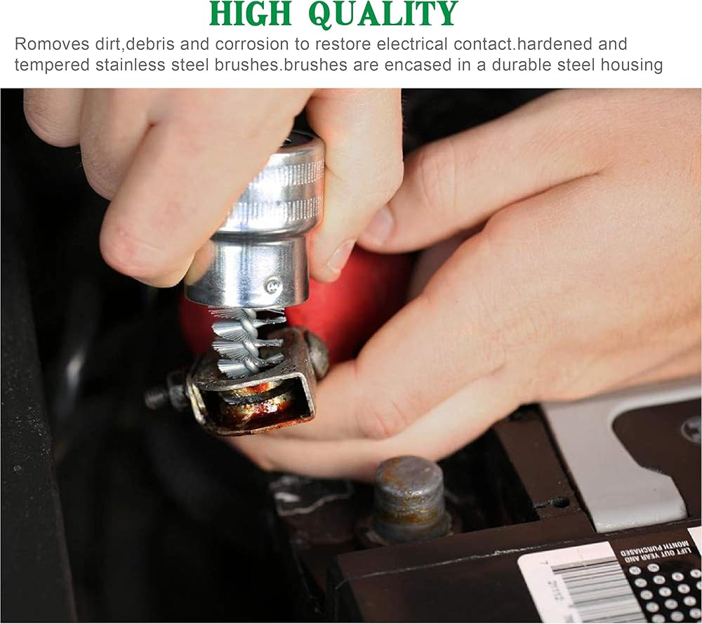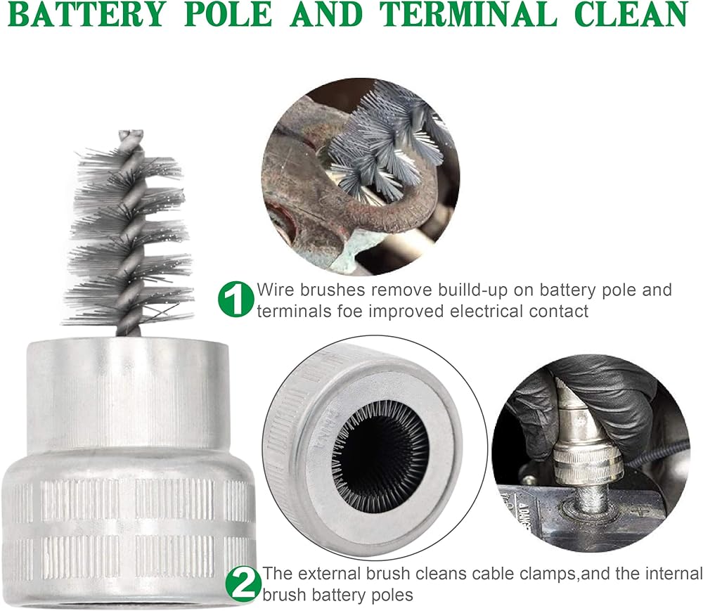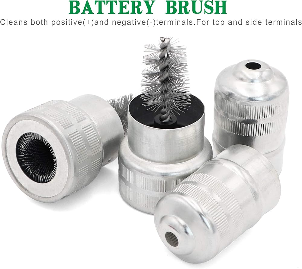 تتضمن العبوة: 10 قطع من غسالات البطارية المضادة للتآكل (5 حمراء و5 خضراء) وقطعتان من فرشاة تنظيف أطراف البطارية.
