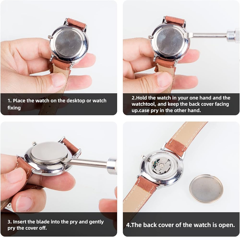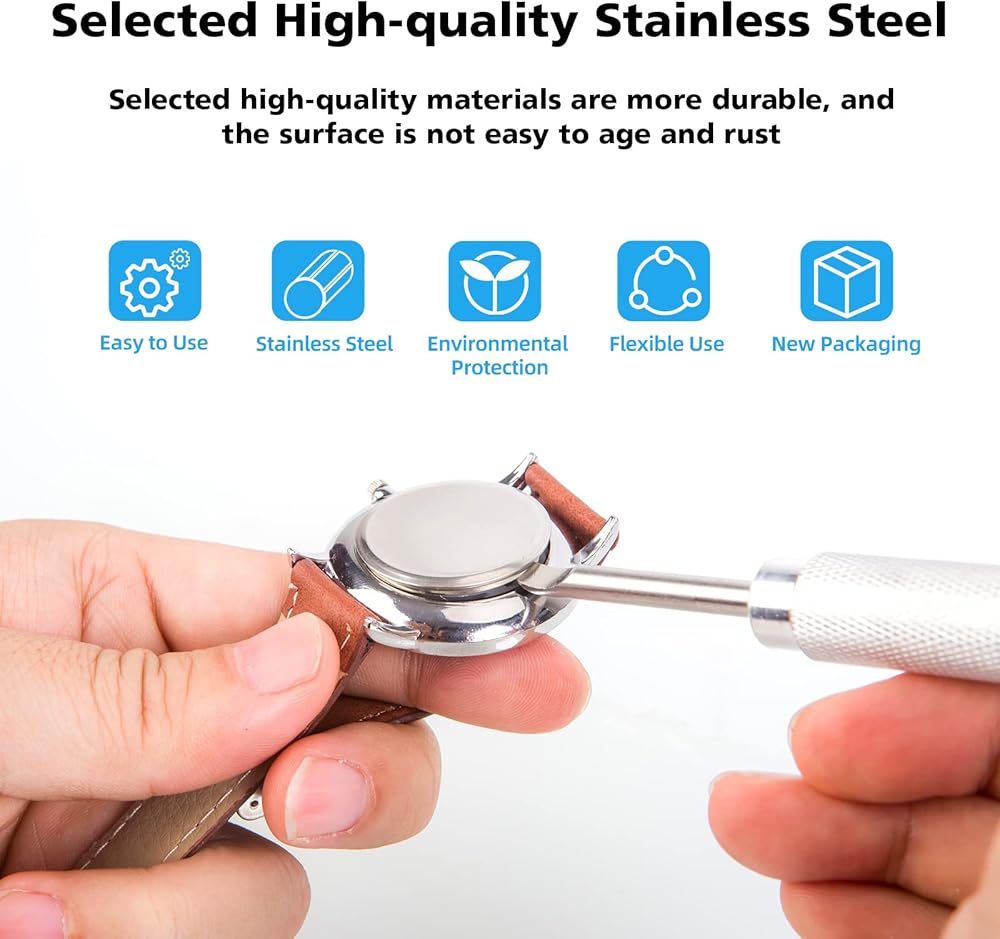 • سهل الاستخدام: إن رأس أداة الإزالة سهل الاستخدام للغاية. أولاً، أدخل هذه الأداة في الشق الموجود في الجزء الخلفي من الساعة. بعد ذلك، افتح الغطاء بلطف واستخدم قوة الرافعة لفتح الجزء الخلفي من الساعة بسهولة. قد تنزلق عن طريق الخطأ على عروات الجراب الخلفية، يرجى تذكيرك برفعه وإزالته بلطف.