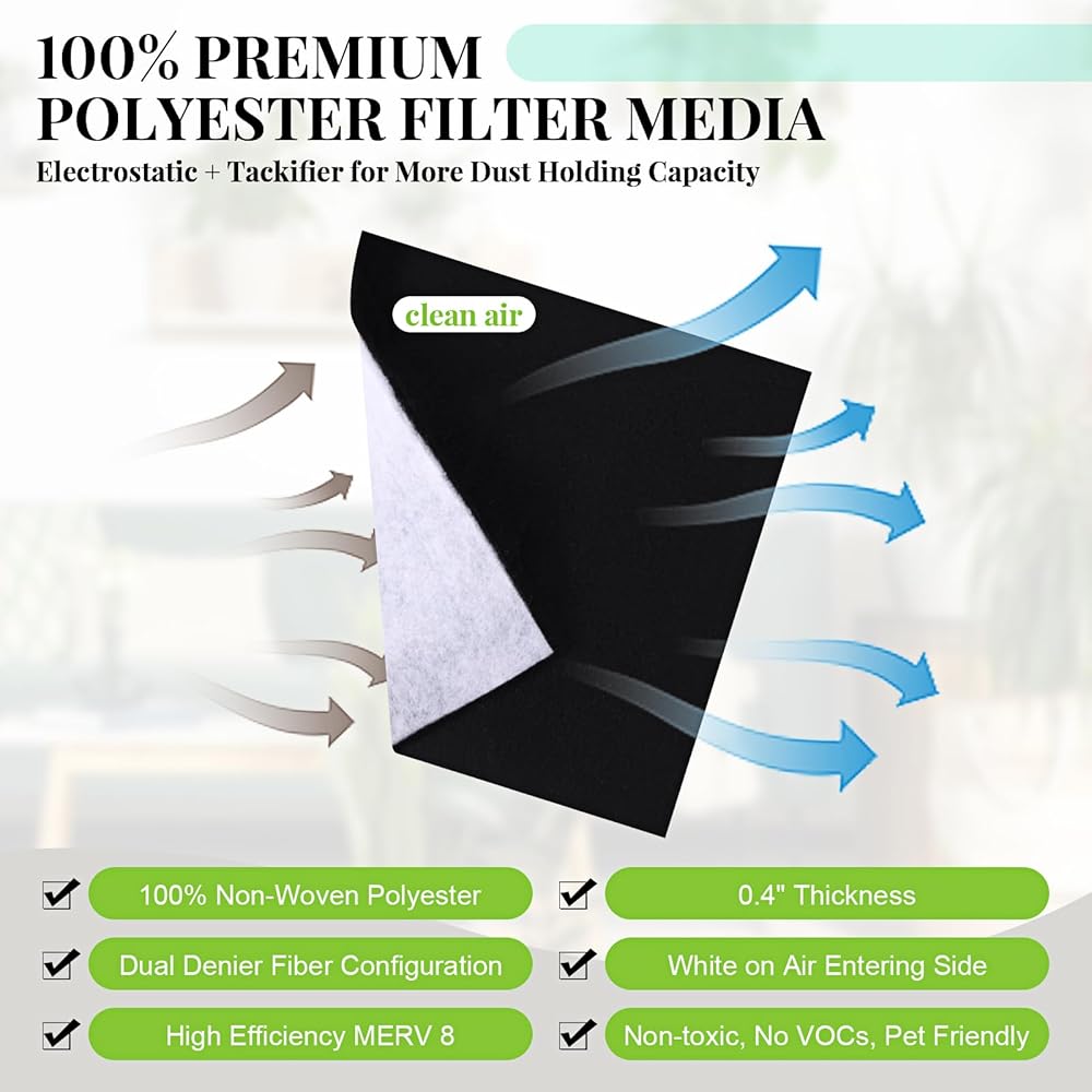 مواد عالية الجودة للنقاء: يتم تصنيع فلاتر تهوية الهواء للمنزل من البوليستر غير المنسوج عالي الجودة لضمان متانة لطيفة وتنقية الهواء؛ يضمن شريط الخطاف اللاصق المصنوع من الغراء اللاصق والنايلون رابطة قوية؛ يتم استخدام طبقتين مختلفتين تمامًا من الوسائط، كل منهما أكثر كثافة من التي تسبقها؛ يتيح توجيه الألياف الكثيفة تدريجيًا تحميل الجسيمات الصغيرة، تليها مرحلة لاصقة غير سامة على MERV 8 فقط للترشيح الثلاثي النهائي