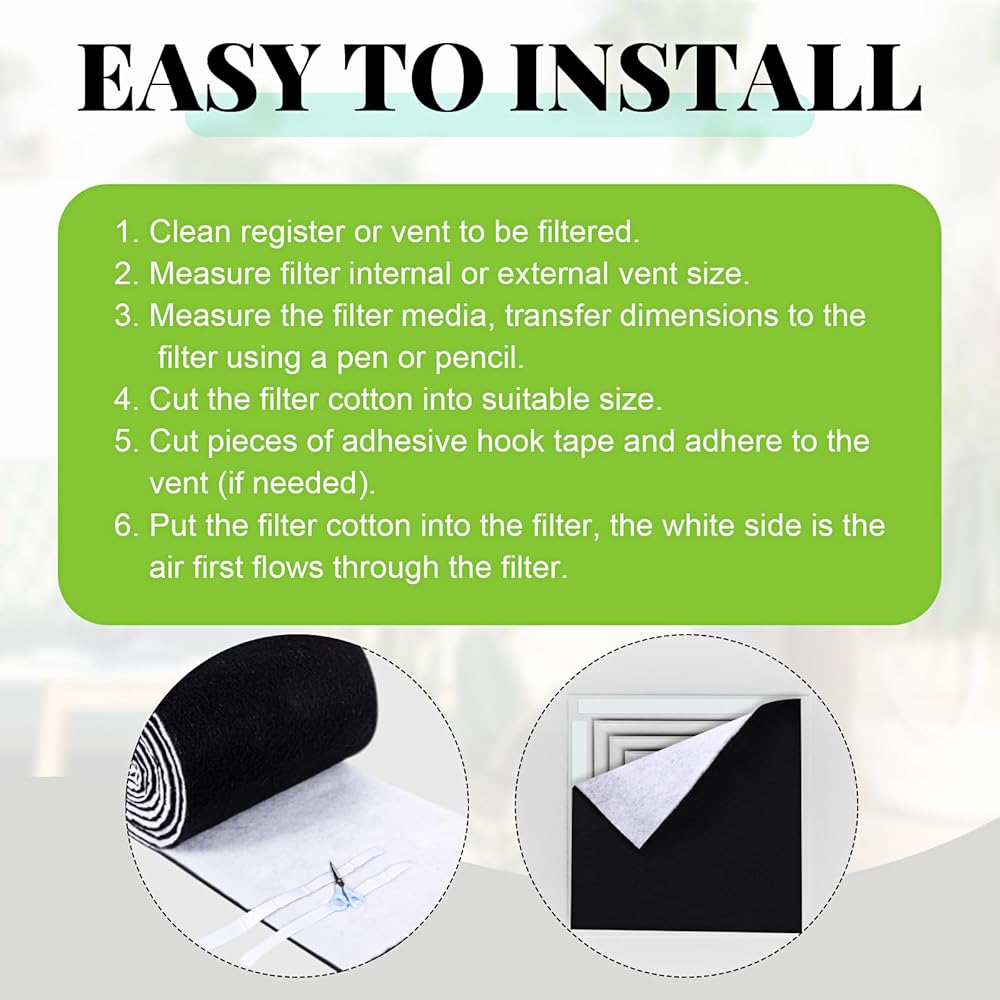 مجموعة فلاتر فتحات تهوية الهواء الكاملة: مع لفة فلتر فتحة تهوية أرضية واحدة تقريبًا. 16 بوصة × 197 بوصة × 0.4 بوصة وشريط لاصق واحد تقريبًا. 1 بوصة × 197 بوصة، توفر لفة فلتر السجل الأرضي تغطية لطيفة لاحتياجات منزلك، مما يمنحك مرونة كبيرة لتغطية فتحات التدفئة والتهوية وتكييف الهواء (HVAC) متعددة الحجم القياسية؛ لاحظ أن المنتج معبأ بالفراغ، ويمكن ضغطه بعد استلام البضائع، يرجى العلم بالسمك الفعلي