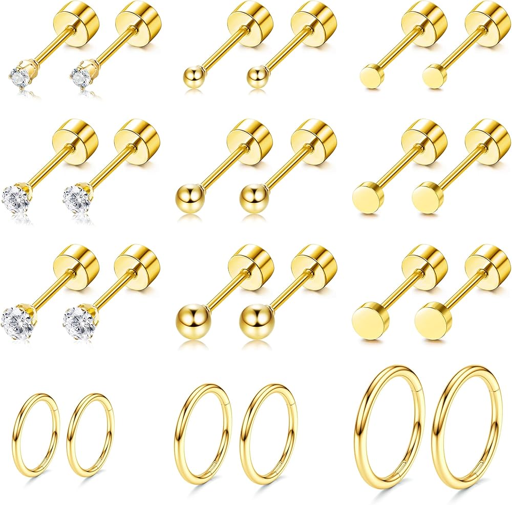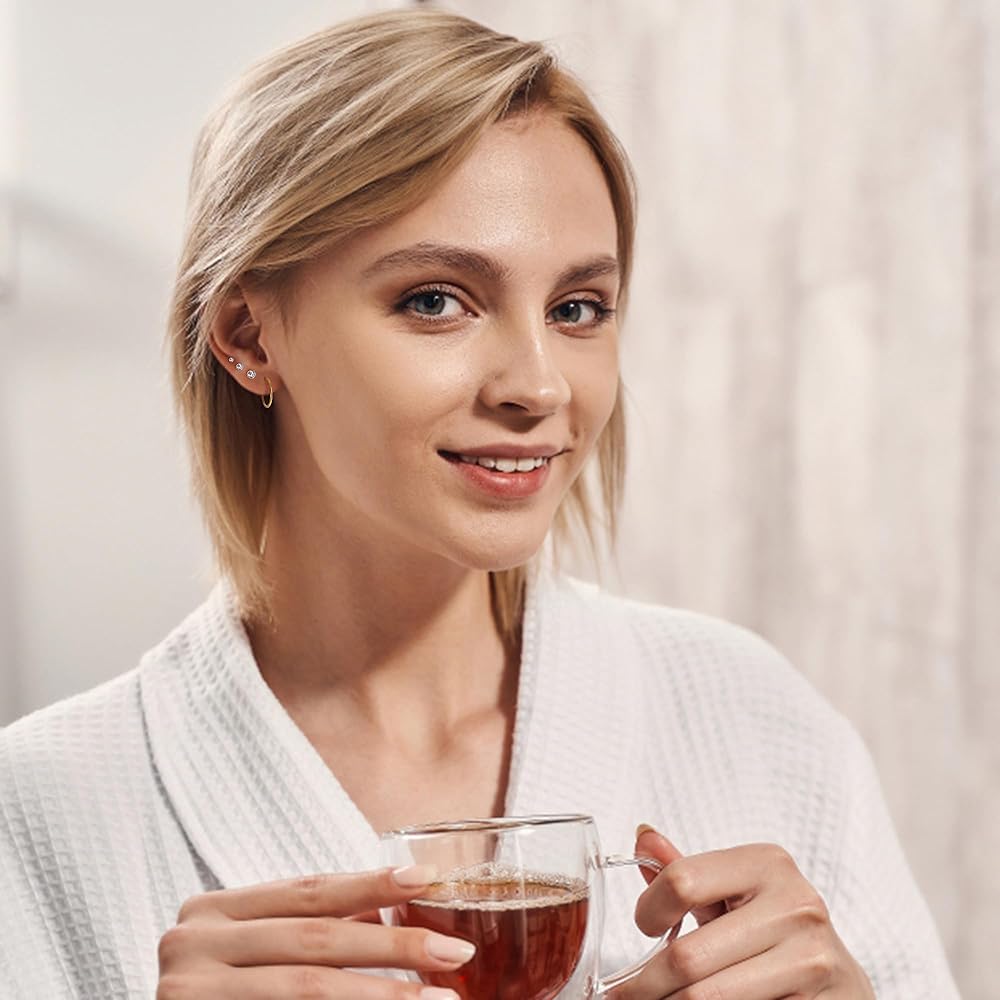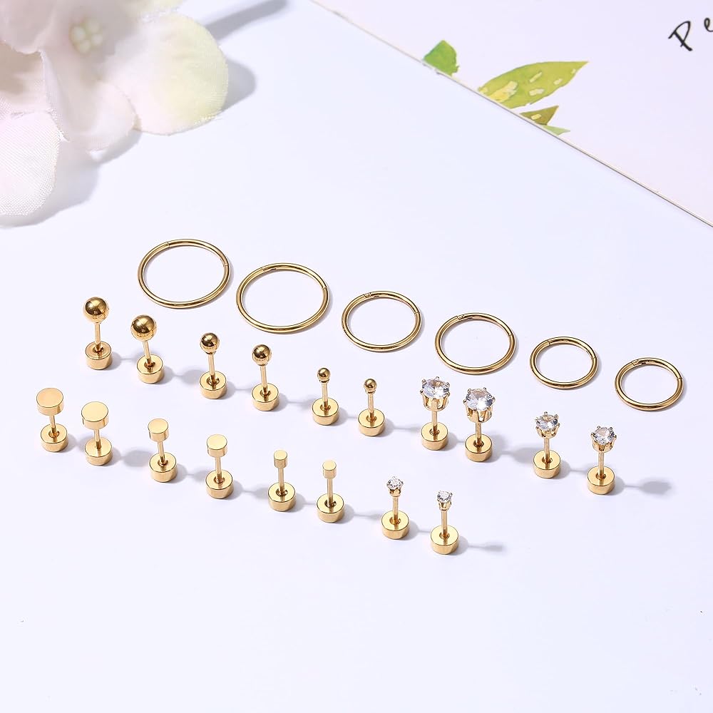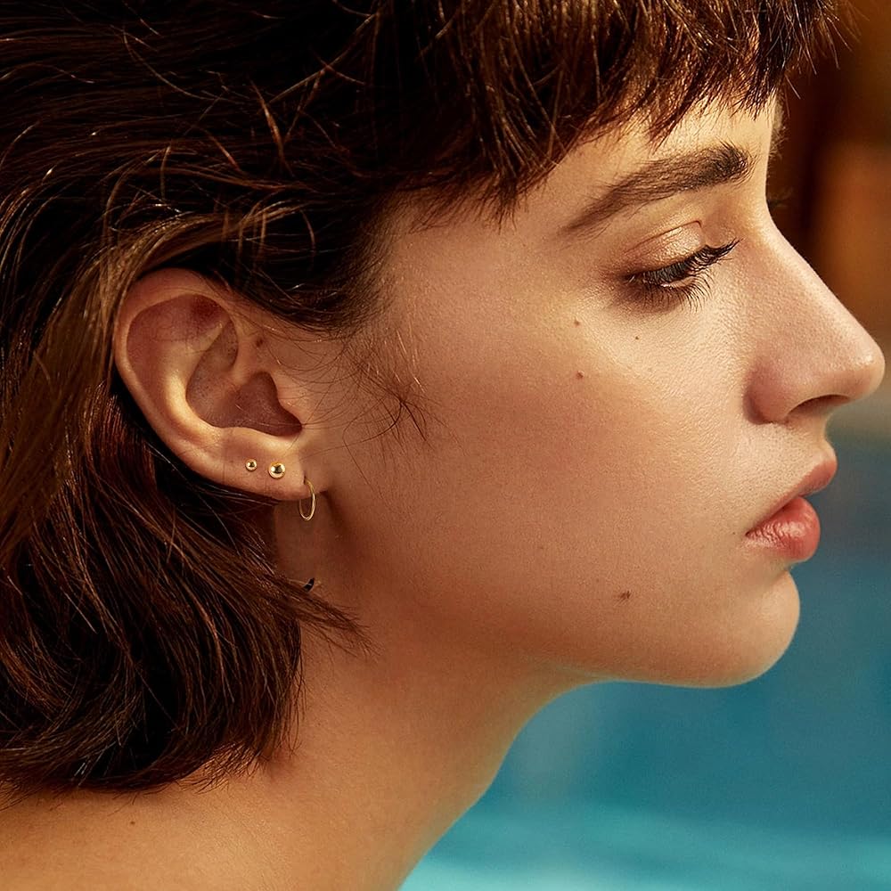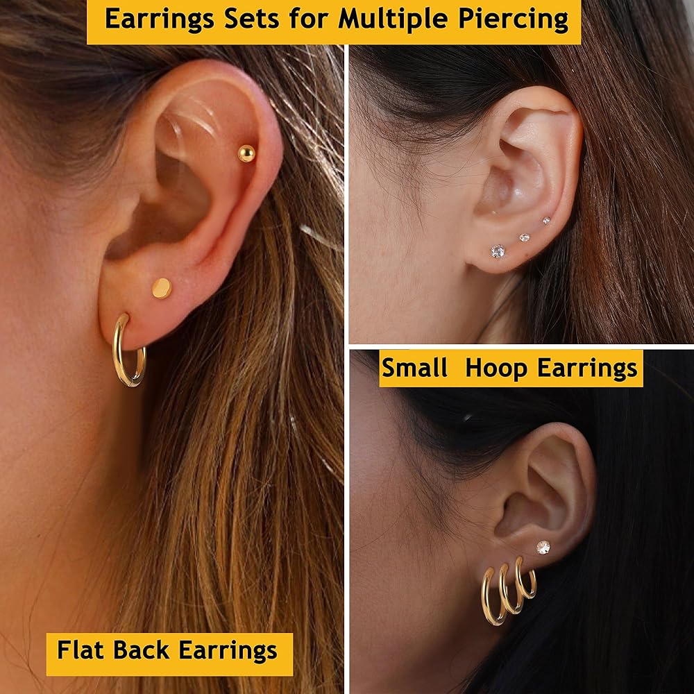 مجموعات الأقراط للعديد من الأقراط الحلقية الصغيرة المثقوبة وأقراط الغضروف المسطحة الصغيرة مناسبة للفتحة الأولى، والفتحة الثانية، والفتحة الثالثة. ويمكن استخدامها أيضًا كأقراط حلقية غضروفية، أو أقراط مسمارية غضروفية، أو قرط مسمار لوبير، أو مجوهرات ثقب الحلزون. طابق أسلوبك.