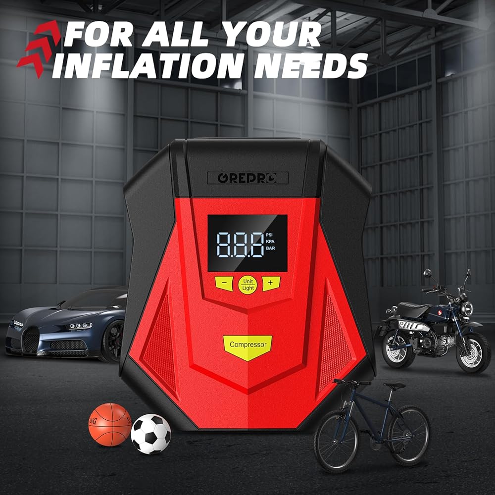[استخدامات متعددة]: منفاخ الإطارات GREPRO مع قابس ولاعة السجائر في السيارة 12 فولت، يمكنك استخدامه في أي مكان. يأتي مع 3 محولات إضافية وصمام. تلبي مضخة الهواء لدينا احتياجات مختلفة قابلة للنفخ، بما في ذلك على سبيل المثال لا الحصر سيارات السيدان الصغيرة أو متوسطة الحجم، وسيارات الدفع الرباعي، والمركبات الرباعية، والدراجات، والدراجات النارية، والمراتب الهوائية، والقوارب القابلة للنفخ، والكرات. (ملاحظة: لا يتم دعم إطارات الشاحنات الثقيلة أو الجرارات)