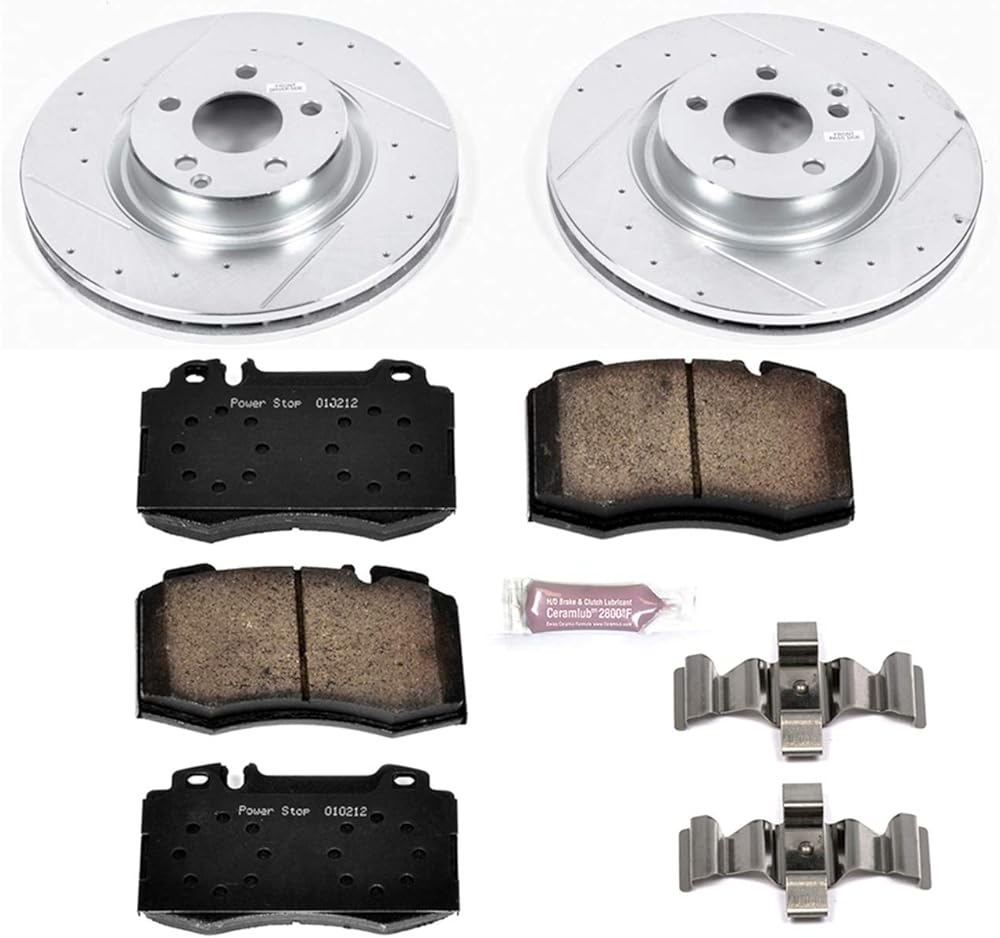وسادات فرامل أمامية Z23 من ألياف الكربون من Power Stop K6599 مع مجموعة دوارات فرامل محفورة ومشقوقة