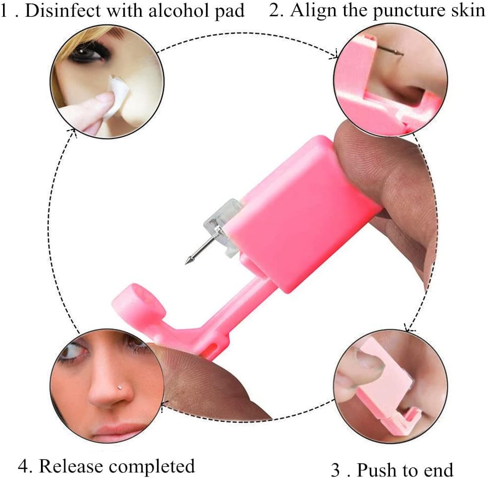 مجموعة ثقب الأنف تتضمن: مسدس + حلقة مسمار + قطن كحولي، جسم المسدس هو منتج حاصل على براءة اختراع بعد الترقية، وهو أفضل استخدام، الأقراط المرصعة الموجودة داخل المسدس مصنوعة من مواد خام من درجة الفولاذ المقاوم للصدأ، بالإضافة إلى تقنية ترصيع الزركون من فئة المجوهرات