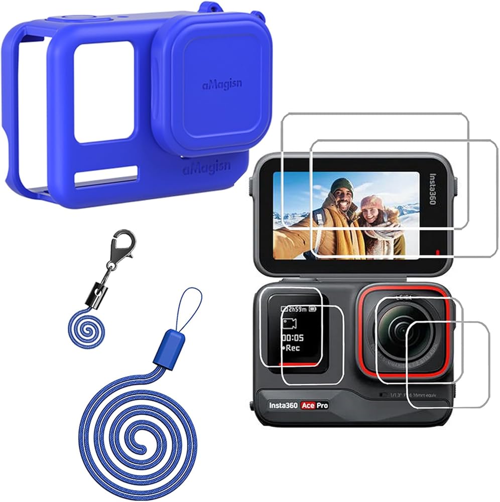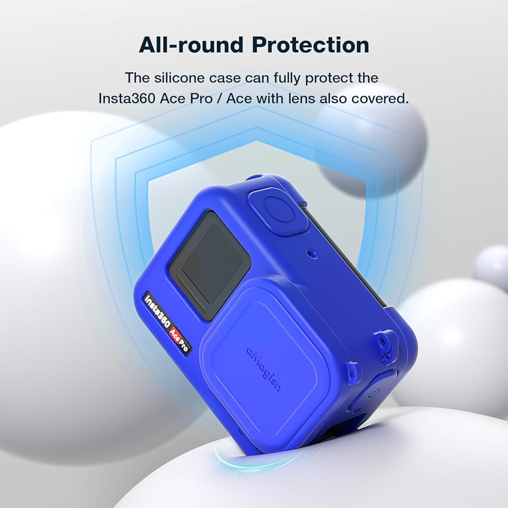 حقيبة حافظة من السيليكون مع واقي شاشة بغطاء عدسة لجهاز Insta360 ACE PRO، غطاء حماية من المطاط الناعم لحماية شاشة LCD الزجاجية (أزرق)