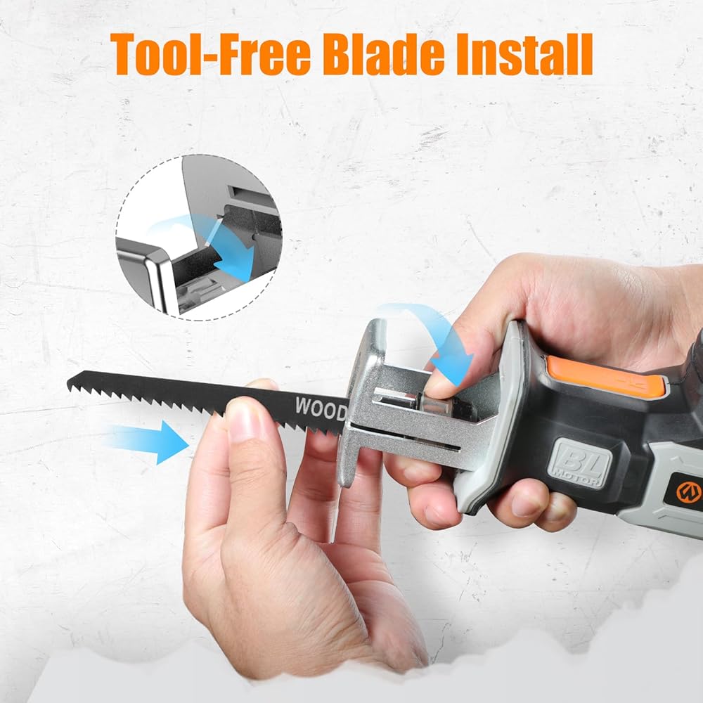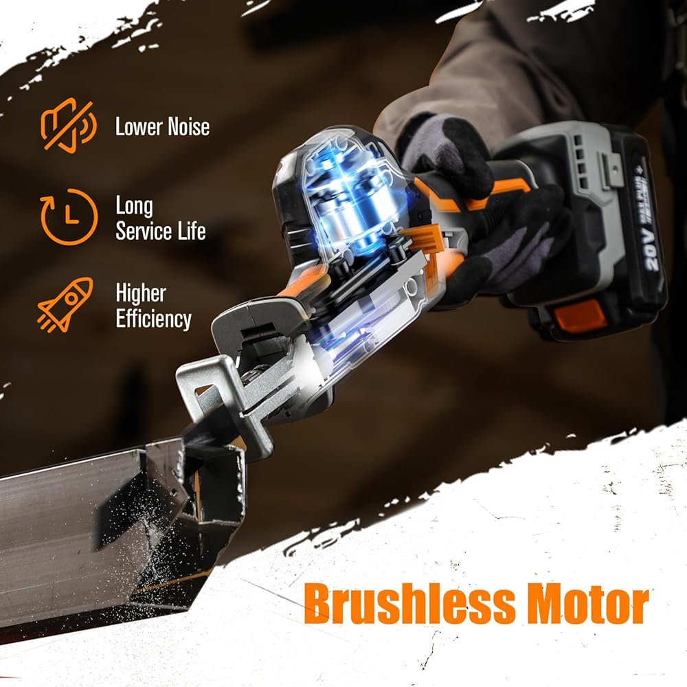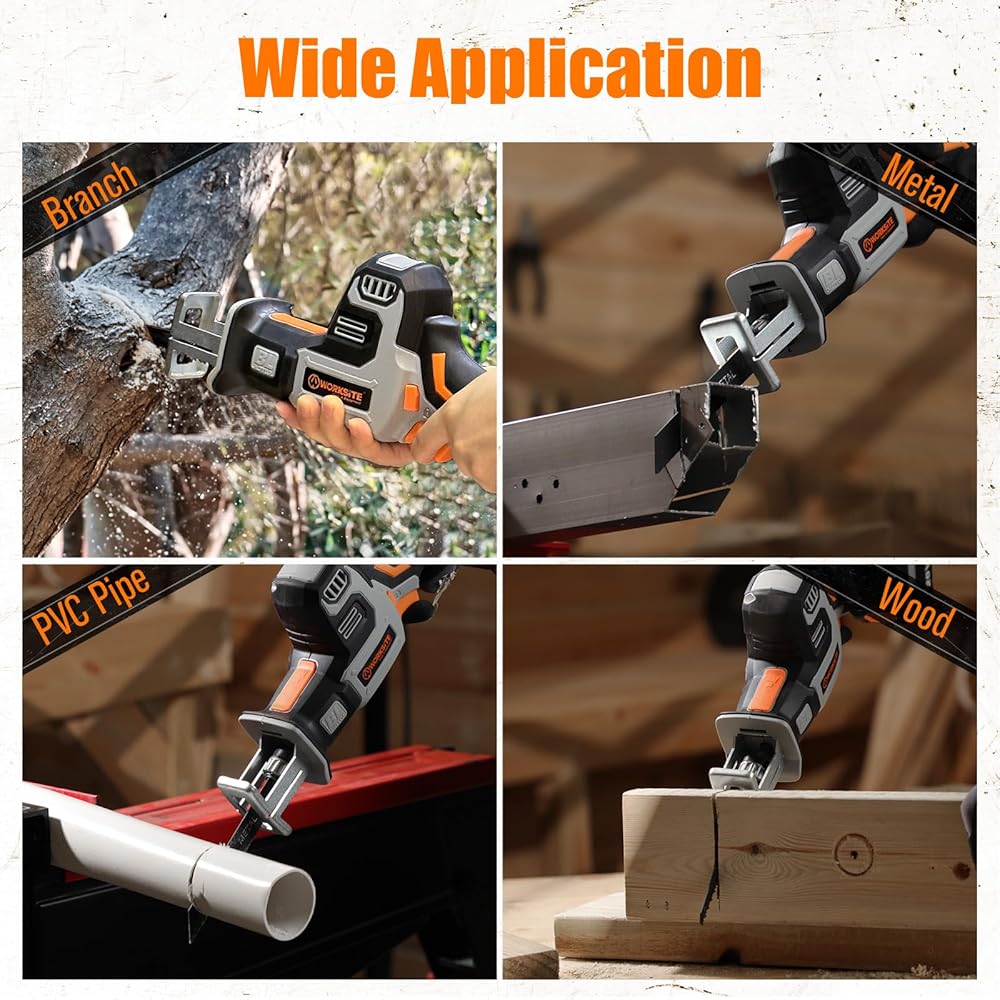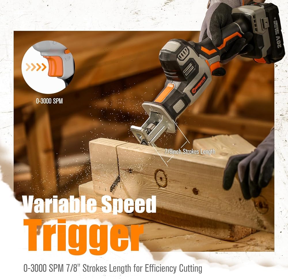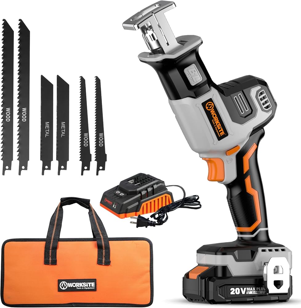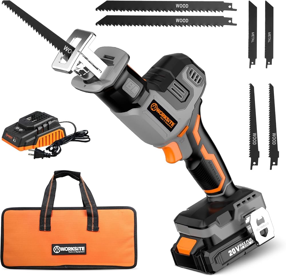 منشار ترددي بدون فرشاة من WORKSITE، منشار ترددي لاسلكي بيد واحدة بقوة 20 فولت مع بطارية 2.0 أمبير في الساعة وشاحن سريع لمدة ساعة واحدة، مشغل متغير السرعة، 6 شفرات منشار لقطع الأنابيب الخشبية/المعدنية/البلاستيكية