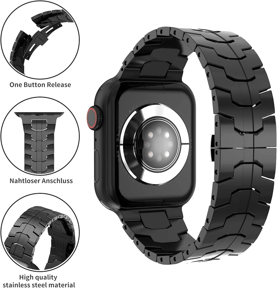 [مادة ممتازة]: مصنوعة من الفولاذ المقاوم للصدأ المصقول 316L. التصميم الجمالي ذو المظهر القوي والخطوط الناعمة عصري ونبيل ومتين وسلس ومريح في الارتداء، مما يجعل ساعة التفاح الخاصة بك أكثر نسيجًا.