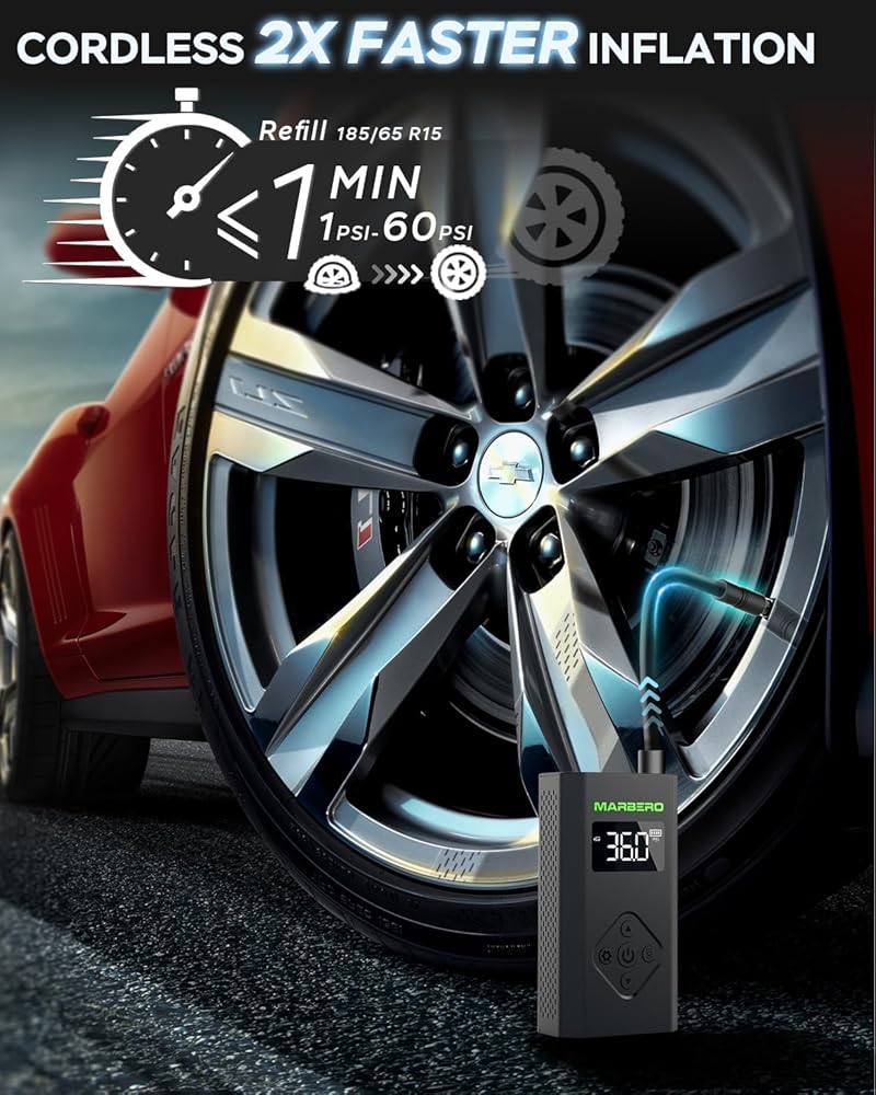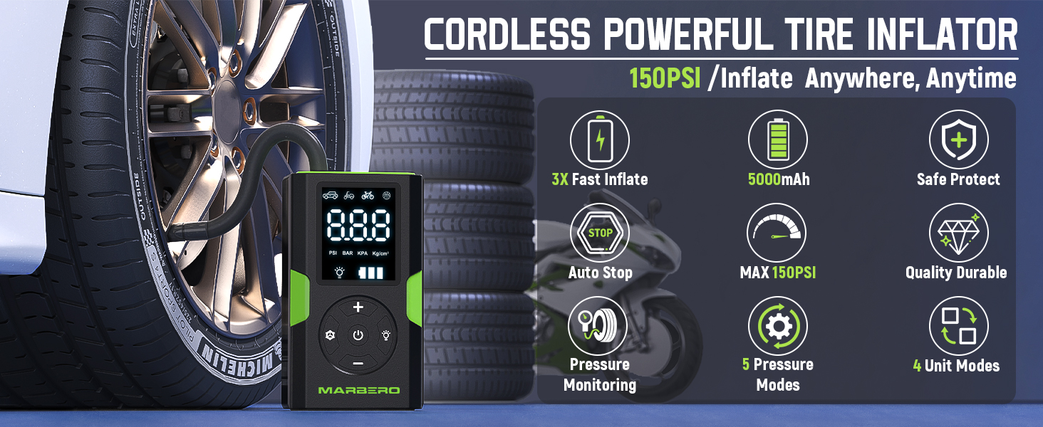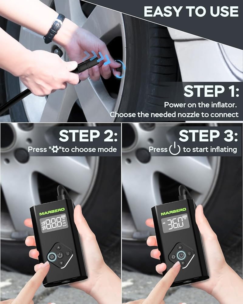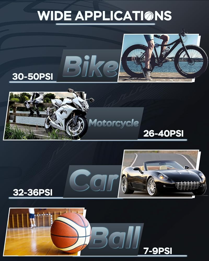 【منفاخ إطارات قوي بوظيفة النفخ】نفخ سريع لمدة 10 ثوانٍ من 33-36 رطل لكل بوصة مربعة مع حجم أسطوانة 17 مم وتدفق هواء محرك قوي 23,500 دورة في الدقيقة يبلغ 17 لتر/دقيقة. نفخ متعدد الاستخدامات: سعة 18.5 وات في الساعة لإطارات السيارات 20 مرة (33-36 رطل لكل بوصة مربعة)، إطارات الدراجات 30 مرة (56-60 رطل لكل بوصة مربعة)، إطارات الدراجات النارية 50 مرة (33-36 رطل لكل بوصة مربعة)، الكرات الرياضية 100 مرة (5-8 رطل لكل بوصة مربعة) . الضغط العالي: الحد الأقصى لضغط التضخم 150 رطل لكل بوصة مربعة. ضغط الإيقاف التلقائي المضبوط مسبقًا: اضبط ضغط النفخ المطلوب ضمن نطاق 3-150 رطل لكل بوصة مربعة. ميزة الإيقاف التلقائي: يتوقف تلقائيًا عند الضغط المحدد مسبقًا للسيارات والدراجات النارية والدراجات الهوائية والكرات الرياضية عند 36 رطل لكل بوصة مربعة، و36 رطل لكل بوصة مربعة، و60 رطل لكل بوصة مربعة، و8 رطل لكل بوصة مربعة. يدعم 4 وحدات ضغط: PSI، وKAP، وBAR، وKG/CM².