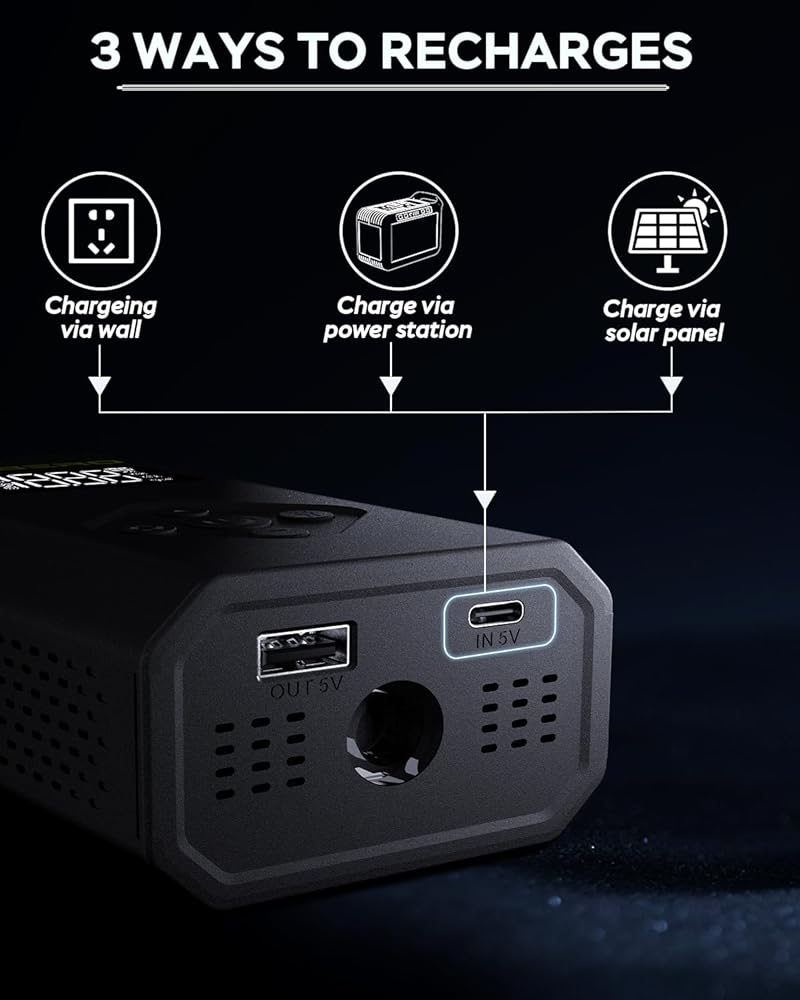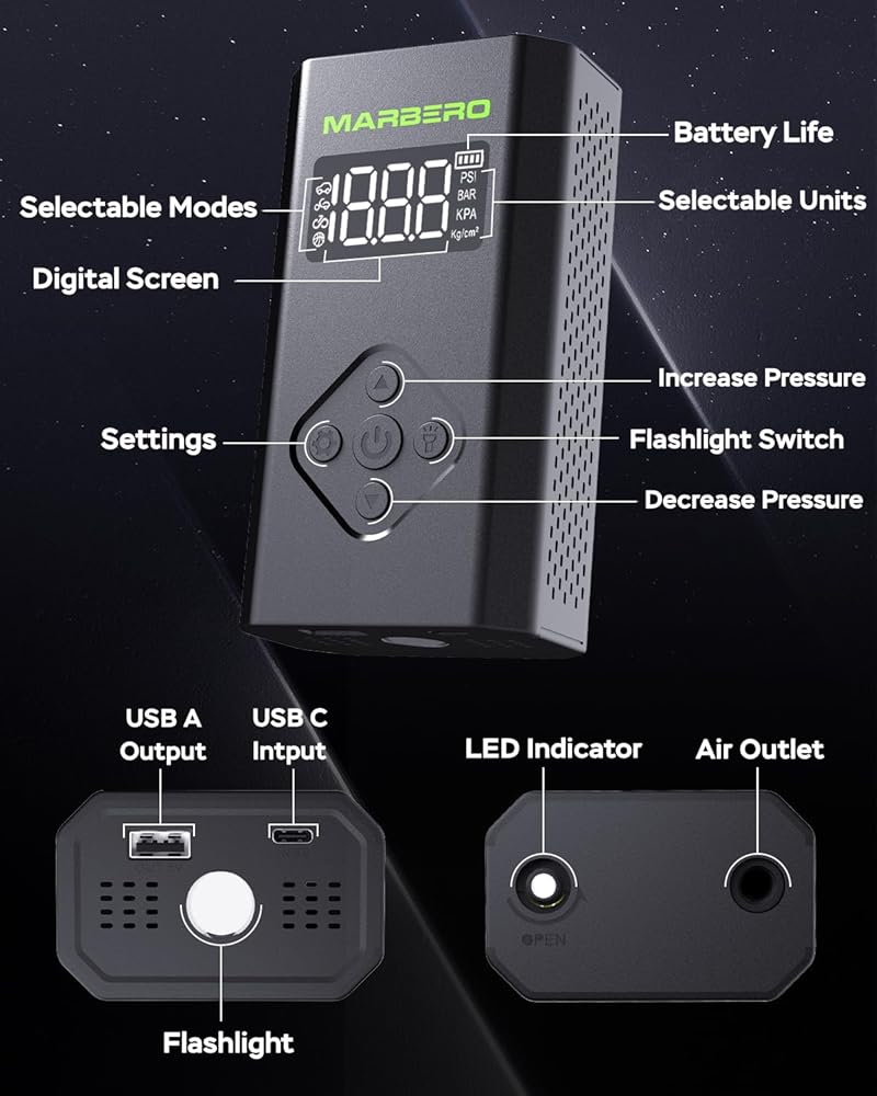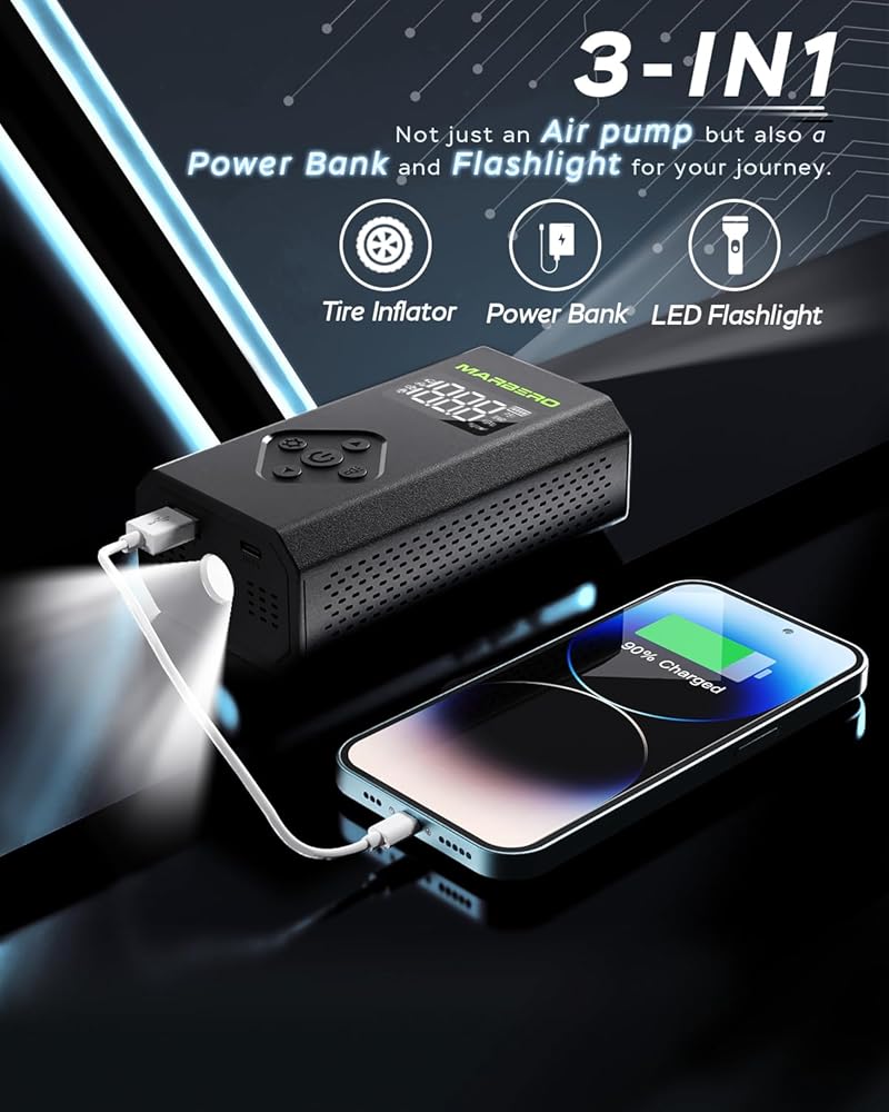 【مضخة هواء مدمجة وخفيفة الوزن لإطارات السيارة 】تخزين الفوهة: مشبك حلزوني للتخزين المريح في مضخة الهواء. مستوى ضوضاء منخفض -38 ديسيبل. وظيفة بنك الطاقة بقدرة 5000 مللي أمبير في الساعة. تشحن الهاتف 1.5 مرة والأجهزة الرقمية المختلفة. مع منفذ شحن USB-C ومنفذ إخراج USB-A. وقت الشحن: 2 ساعة عند 5 فولت/2.1 أمبير. بطارية لاسلكية مدمجة، لا حاجة للاتصال بمصدر طاقة السيارة. إضاءة LED عالية السطوع، تدوم 12 ساعة، نطاق إضاءة 3 أمتار، توفر 3 أوضاع إضاءة: ثابت، وامض، وSOS.