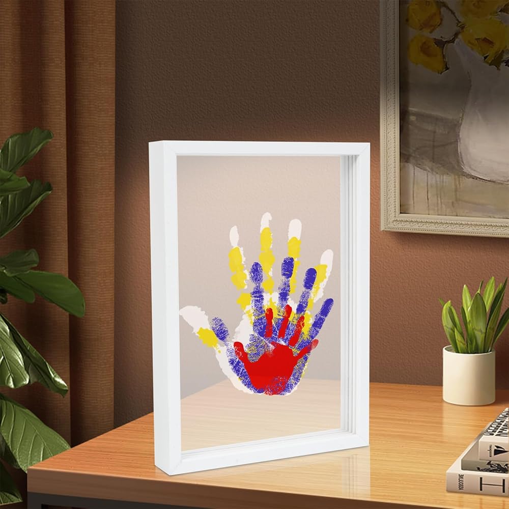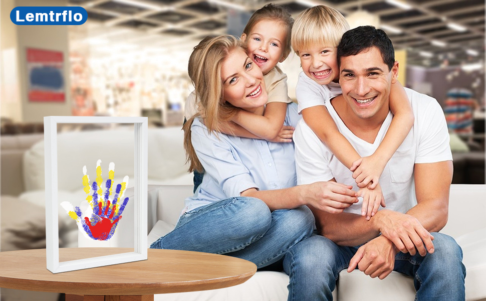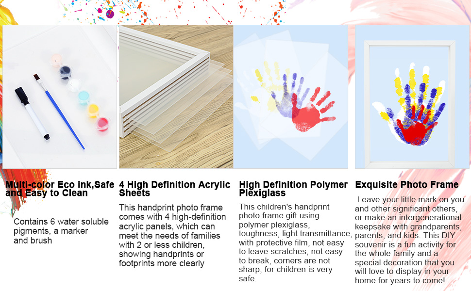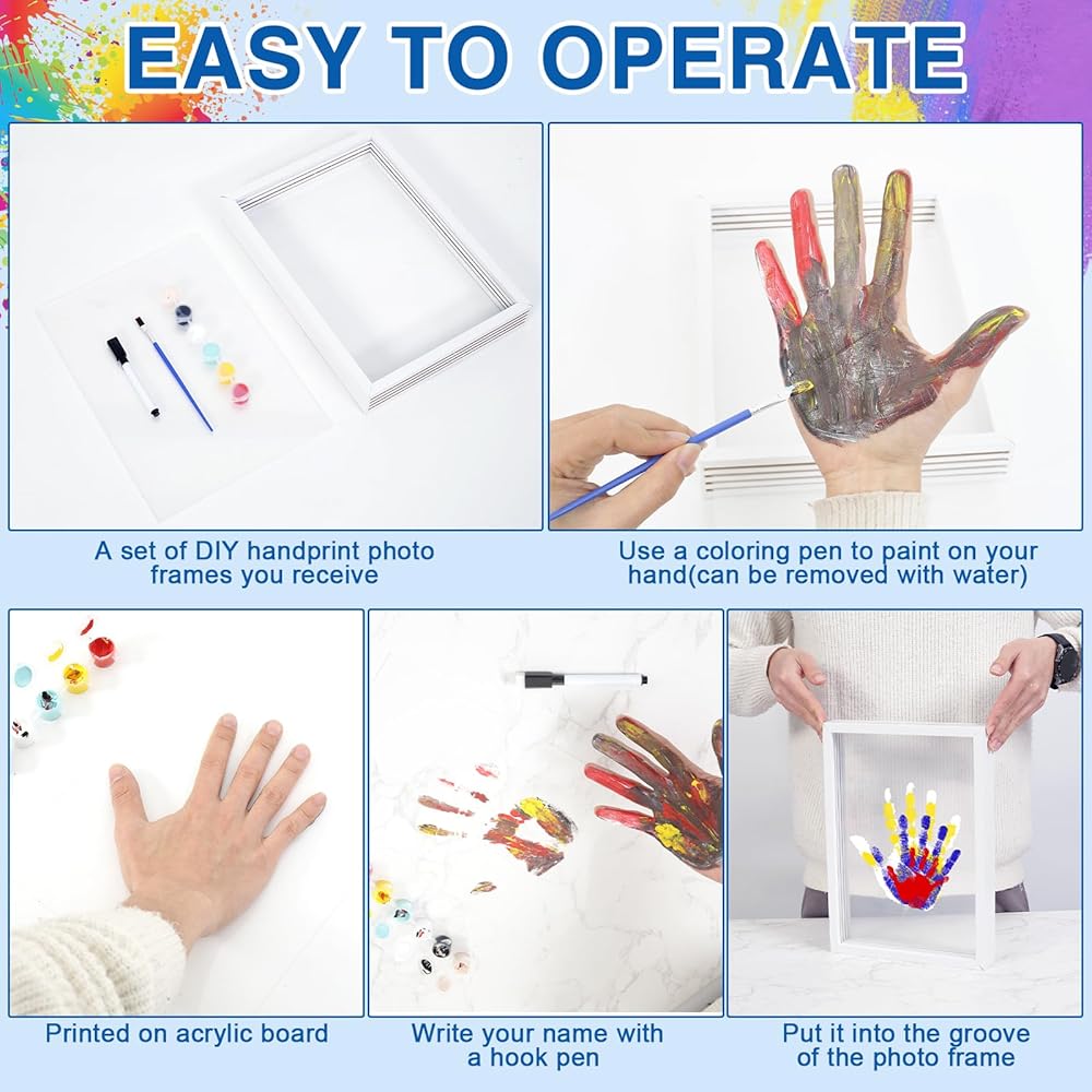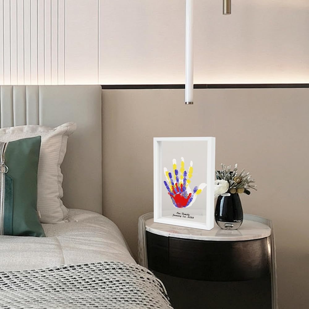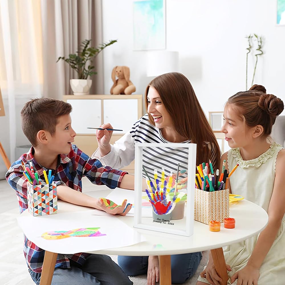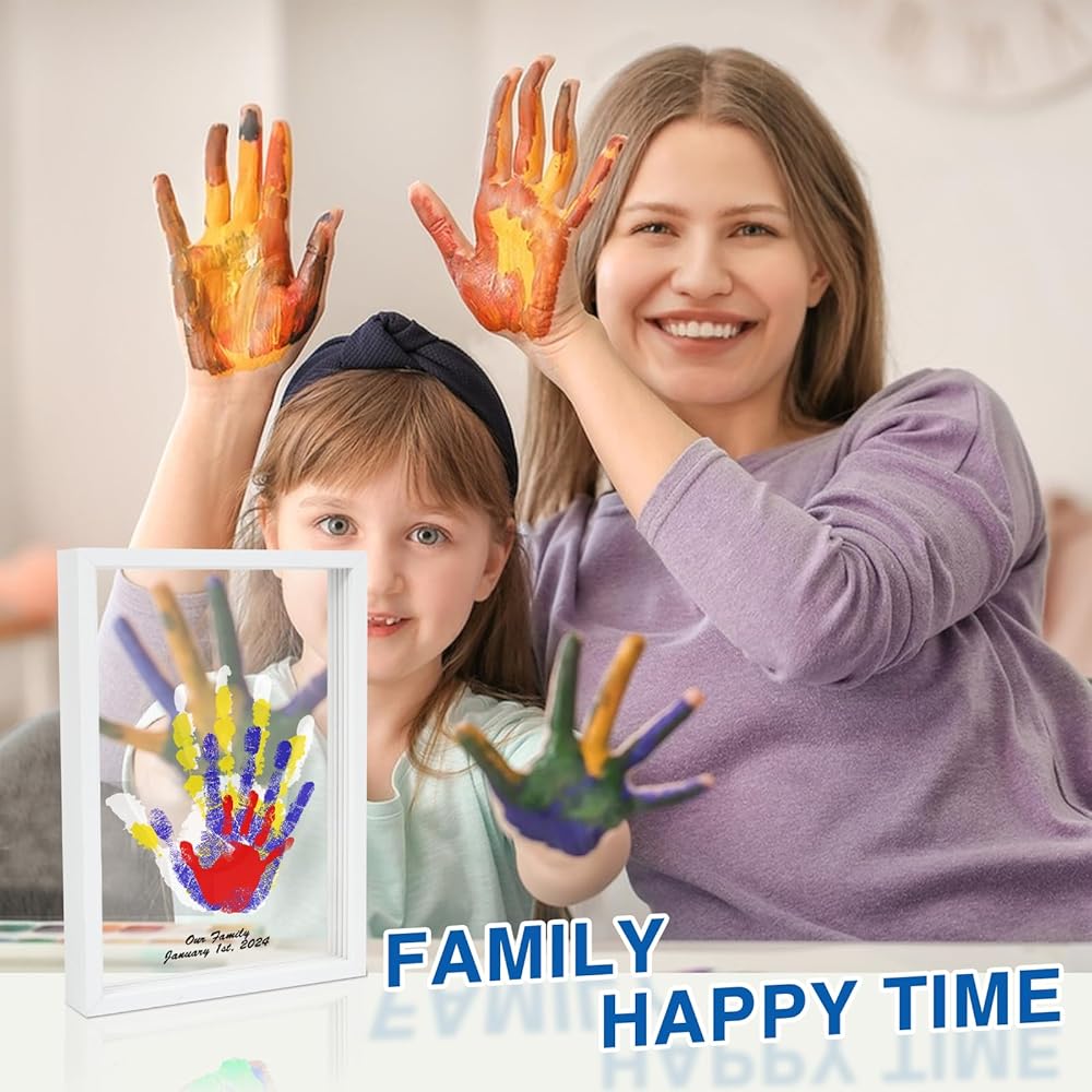 هدية بصمة اليد لجميع أفراد العائلة: تتضمن مجموعة بصمة اليد العائلية إطار صورة خشبي، و4 ألواح أكريليك شفافة، و6 ألوان طلاء، وفرشاة واحدة، وقلم تحديد واحد
