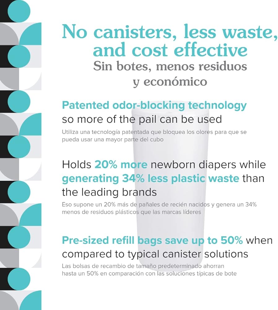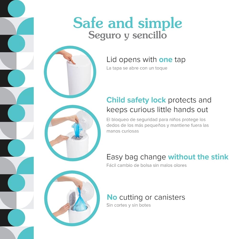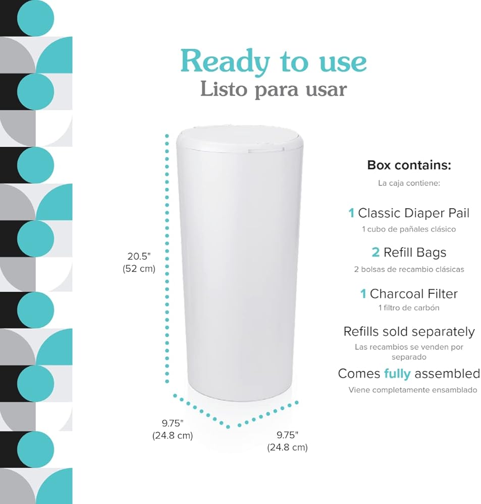 EASY TO USE: Comes fully assembled. Lid opens with one tap. Easy bag change. No cutting or canisters. Child safety lock keeps curious little hands out. Includes 1 Classic Diaper Pail + 2 Refill Bags + 1 Charcoal Filter. Refills sold separately.
