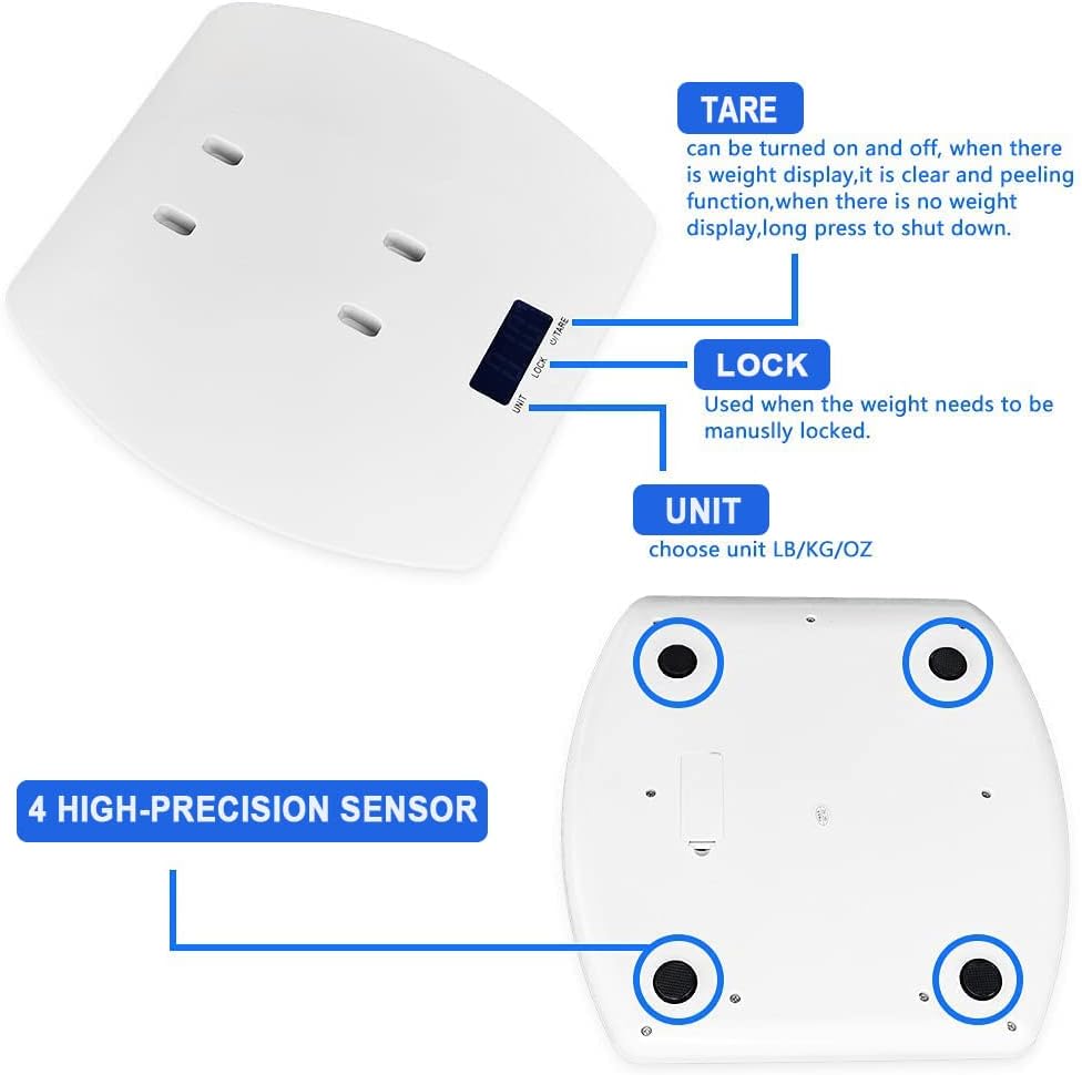 عملية بسيطة: بسيطة لاقامة. لا توجد حواف حادة. الجزء السفلي مجهز ببطانة مضادة للانزلاق، وسطح الميزان مصمم بسطح منحني، وهو آمن. شاشة LCD ذات الإضاءة الخلفية الكبيرة تجعل من السهل قراءتها.