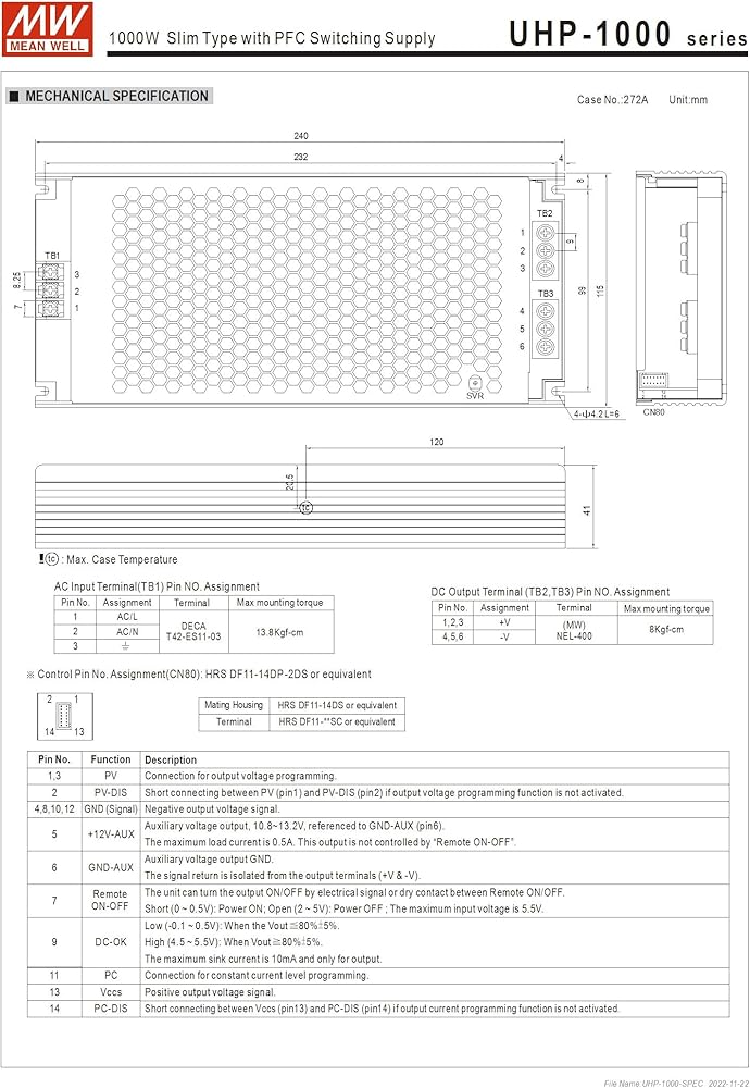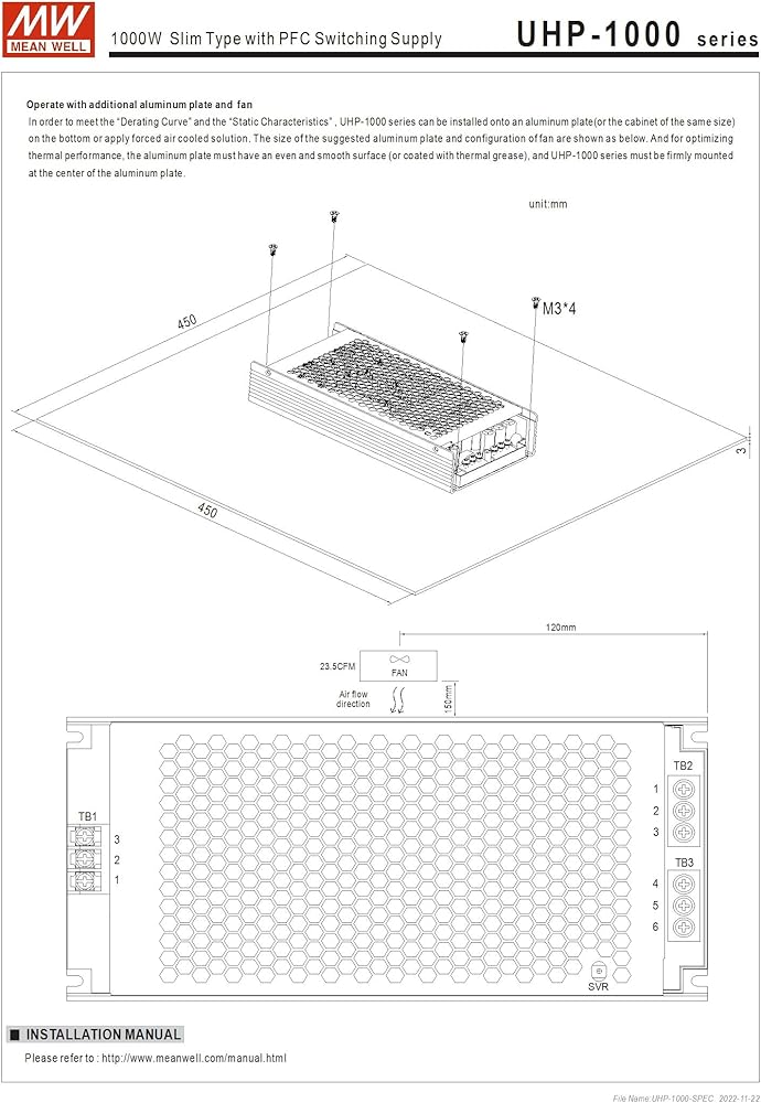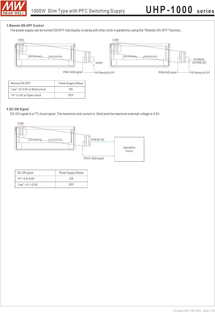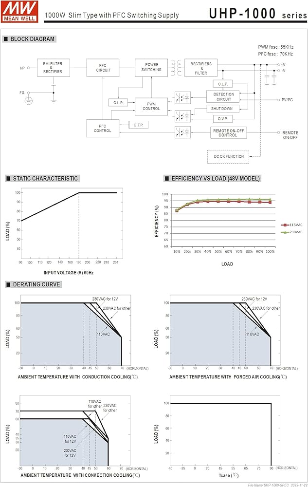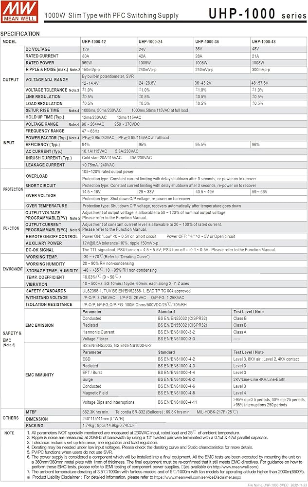 UHP-1000 series is a 1000W single-output slim type power supply with 41mm of low profile design. Adopting the full range 90~264VAC input, the entire series provides an output voltage line of 24V. In addition to the high efficiency up to 96%, that the whole series operates from -22F ~ 158F under air convection without fan. UHP-1000 has the complete protection functions and 5G anti-vibration capability; It is complied with the international safety regulations such as TUV BS EN/EN62368-1,UL62368-1. UHP-1000 series serves as a high performance power supply solution for various industrial applications.