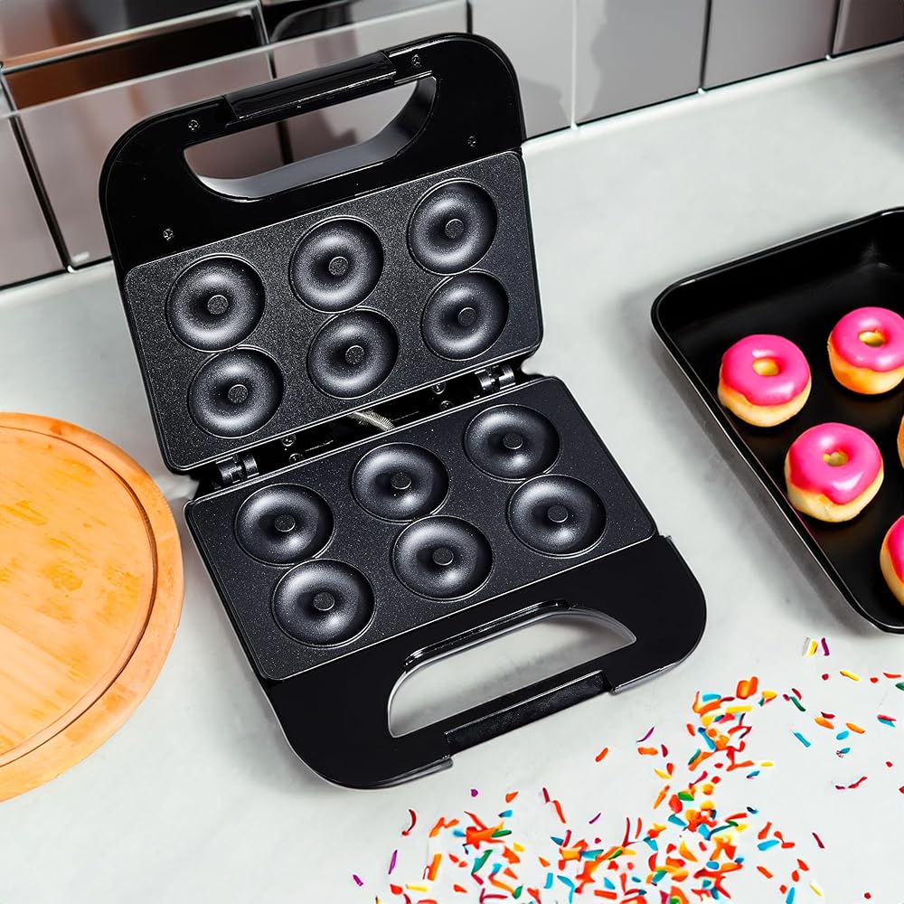 اطبخ باستخدام صانع الدونات الصغير الملون: اصنع حلوى ملونة بألواح غير لاصقة بقوة 750 وات، ومقبض سهل التنظيف، وملمس بارد، وأقدام مقاومة للانزلاق؛ تصنع 6 قطع دونات لحلويات مناسبة للأطفال، باللون الأسود
