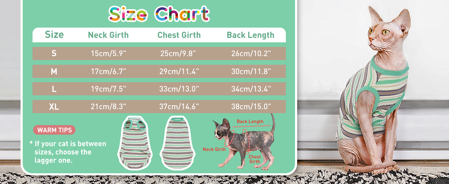 【4 مقاسات متاحة】 هناك 4 مقاسات من قمصان القطط للقطط فقط، تتراوح من S إلى XL. معيار حجم سترات القطط للقطط فقط مناسب للقطط التي لا شعر لها، ويوصى بالقطط الأخرى أو الكلاب الصغيرة لاختيار حجم أكبر. من أجل راحة حيوانك الأليف، يرجى القياس بعناية وفقًا لمخطط مقاسات ملابس القطط قبل تقديم الطلب.