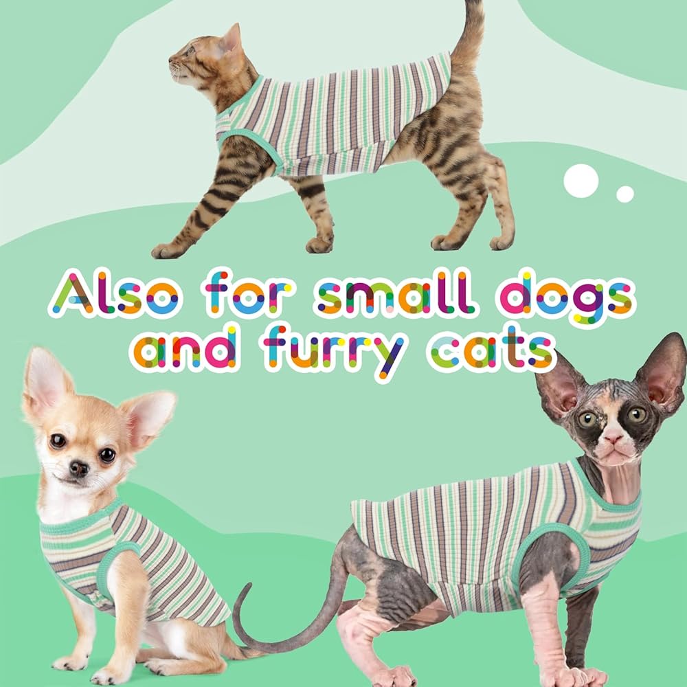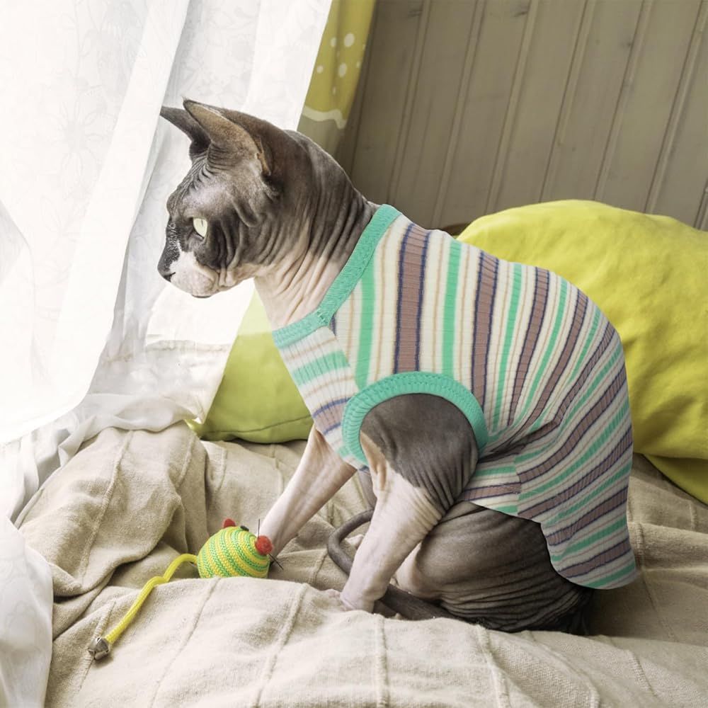 【تصميم عصري مخطط وعملي】 Sphynx رائع دائمًا، وسترة القطط Sphynx ذات النمط المخطط بالألوان تجعل قطتك أنيقة مميزة. ملابس قطط أبو الهول هذه تناسب الفصول الأربعة. في الصيف، تعتبر سترة القطط الممتصة للعرق مريحة للغاية عند ارتدائها وتمنع ارتفاع درجة الحرارة وستحافظ سترات القطط على دفء القطط في البيئات الباردة والشتاء. كما تحافظ بيجامة القطط على نظافة القطط وتحميها من التعرض للأذى.