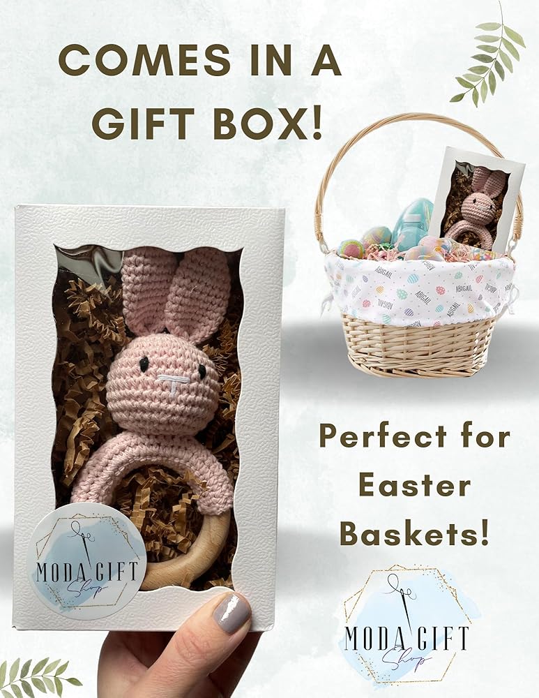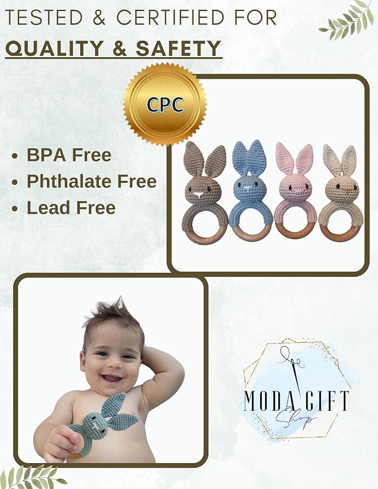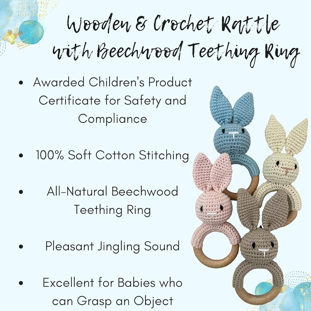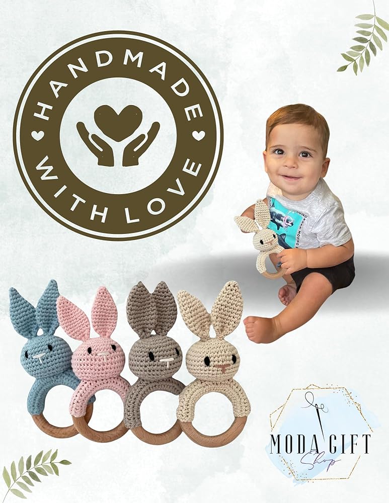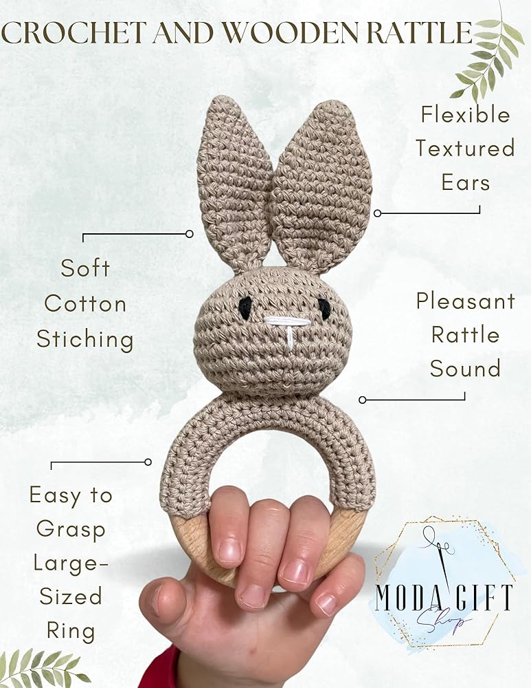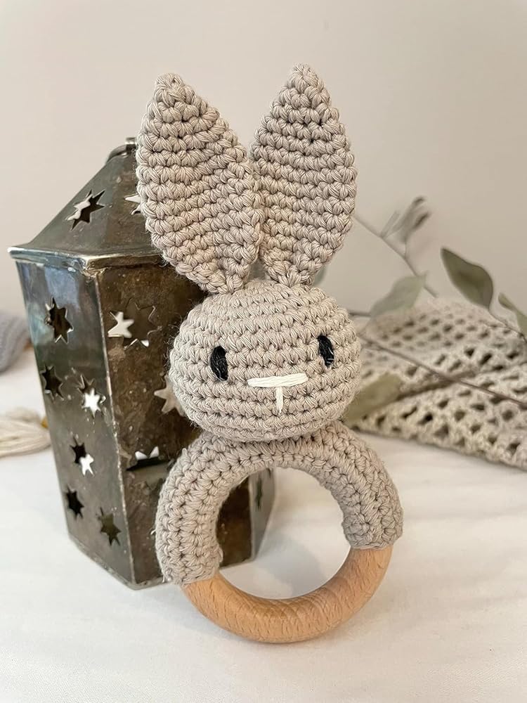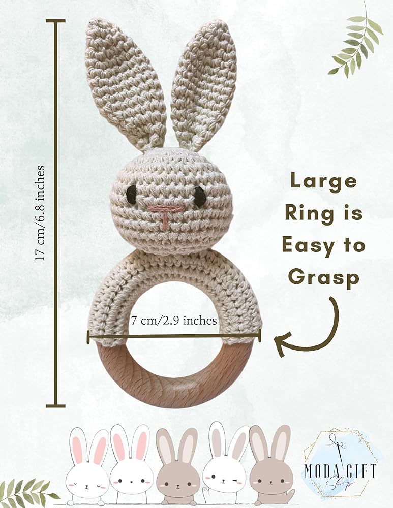 This handmade baby toy functions as a rattle, sensory toy, and comfort toy. Perfect for babies who are able to grasp and hold onto an object. Makes a wonderful baby shower gift or present for a new mom. PROMOTES SENSORY DEVELOPMENT Your baby will enjoy the soft jingling sound of the rattle when he or she manipulates the toy. This promotes sensory development with cause and effect, hand eye coordination, and fine motor skills. Rattle is hand crafted from various materials which promotes exploration. Baby can explore the smooth and non-toxic beechwood ring, or the soft crochet stitching. EASY TO GRASP Wooden ring is 7 cm/2.1 inches in diameter, making it easy for baby to grasp. Most competitors offer only a 5 cm ring, which is harder for baby to enjoy with both hands. SAFE AND NON TOXIC MATERIALS 100% cotton yarn used for all stitching. Soft and durable material. Wooden ring is made from non-chemically treated beechwood with CE certification. No glue or easily broken parts. Only sutured materials on the outside of the toy, so as there are no small parts easily accessible to baby. There is a rattle inside the rabbit head, so please continuously inspect toy for damage or wear and remove from baby if toy becomes damaged.