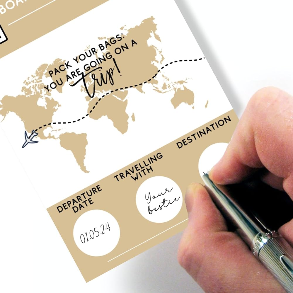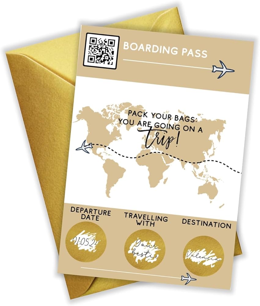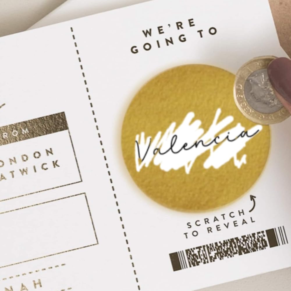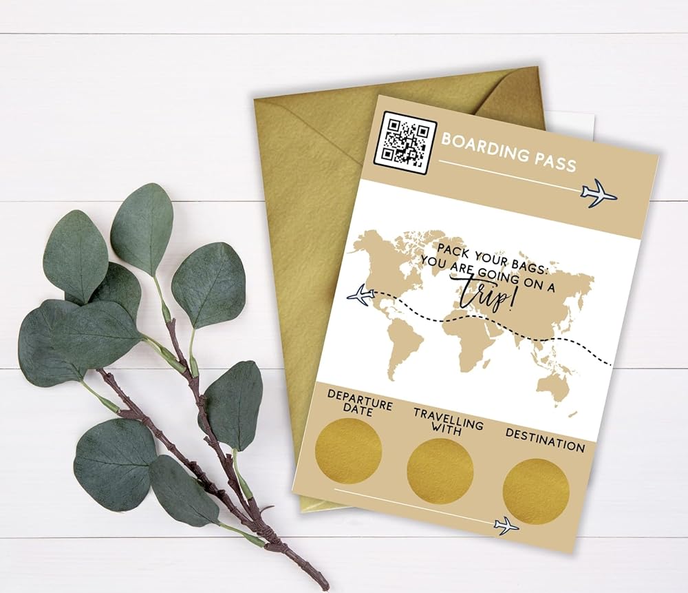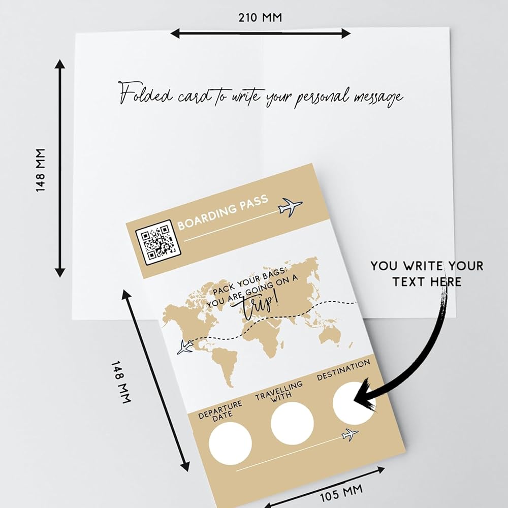 ❤️YOU WILL RECEIVE A professionally printed folded card 150 x 210 mm Material: heavy 250 grams snow white card stock Set of matching envelope in the color of your choice HOW TO ORDER Select your quantity Select the envelope color from the drop-down menu Please note that you will be filling out the customisation yourself, 3 gold scratch of stickers are included seperately! One professionally printed folded card: 4.2 x 5.8 inch or 105 x 148 mm folded. The boarding pass card details are left blank for you to fill in and then hide the destination, travel partner and travel date area with the provided scratch sticker (Easy-to-follow instruction card is included). When your loved one scratches the sticker, their surprise destination will be revealed! We just know it will be the best surprise for them! Material: heavy 250 grams snow white card stock Metallic gold envelope Please note that the 3 scratch off circle stickers will come separately so you will be able to add the text to your cards. We will add an instruction card how to apply the scratch off circle stickers