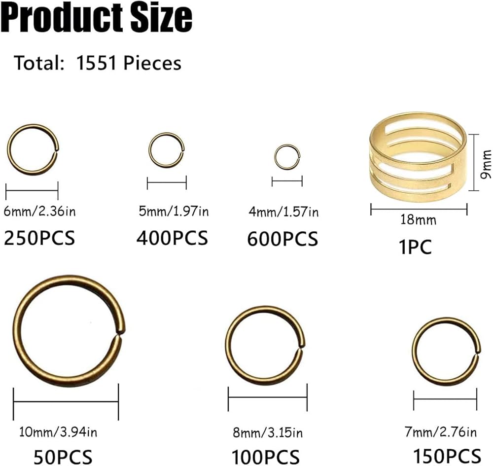 Assorted Sizes Open Jump Rings: This jump rings has different size, about 600pcs for 4mm, about 400pcs for 5mm, about 250pcs for 6mm, about 150pcs for 7mm, about 100pcs for 8mm, about 50pcs for 10mm. There is 1 jump ring opener to help open and close the rings.