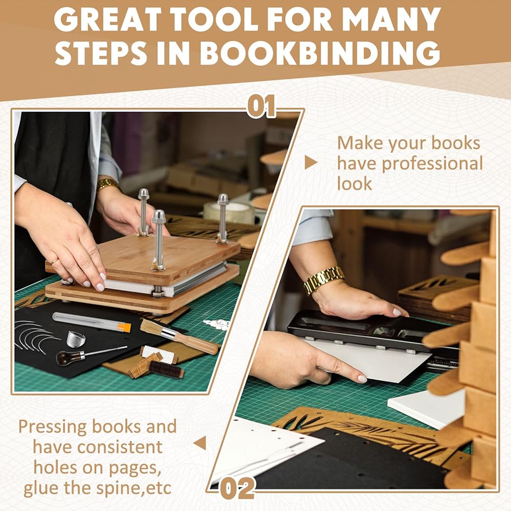 Enhance your bookbinding experience with our compact, lightweight bookbinding tool kit. With a considerable design for binding and pressing, it's made from robust 3 layer cross laminated bamboo structure, ensuring strength and longevity. Its smooth surface and rounded corners ensure comfort whilst creating a sense of aesthetic appeal.