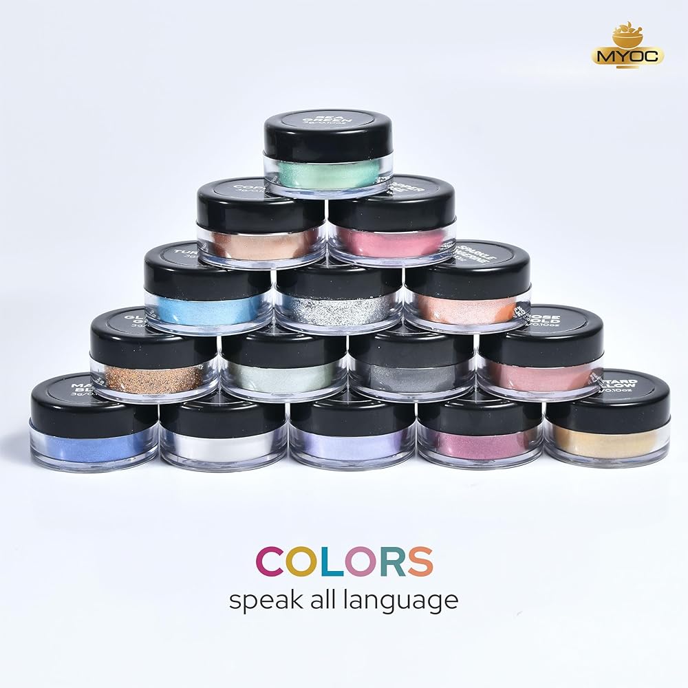 Myoc Mica Powder – Set of 14 (3 g/ 0.11 Oz), Mica Powder Cosmetic Grade for Soap,Candle, Epoxy Resin, Bath Bomb, Ink, Acrylic Paint, Lip Gloss, Shimmery Makeup, Nail Paint & amp; Eye shadow, Mica Powder Bulk