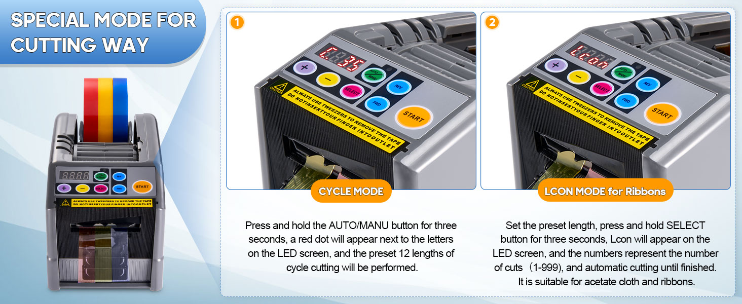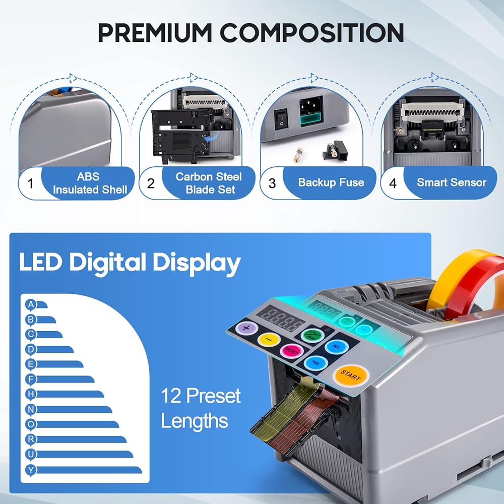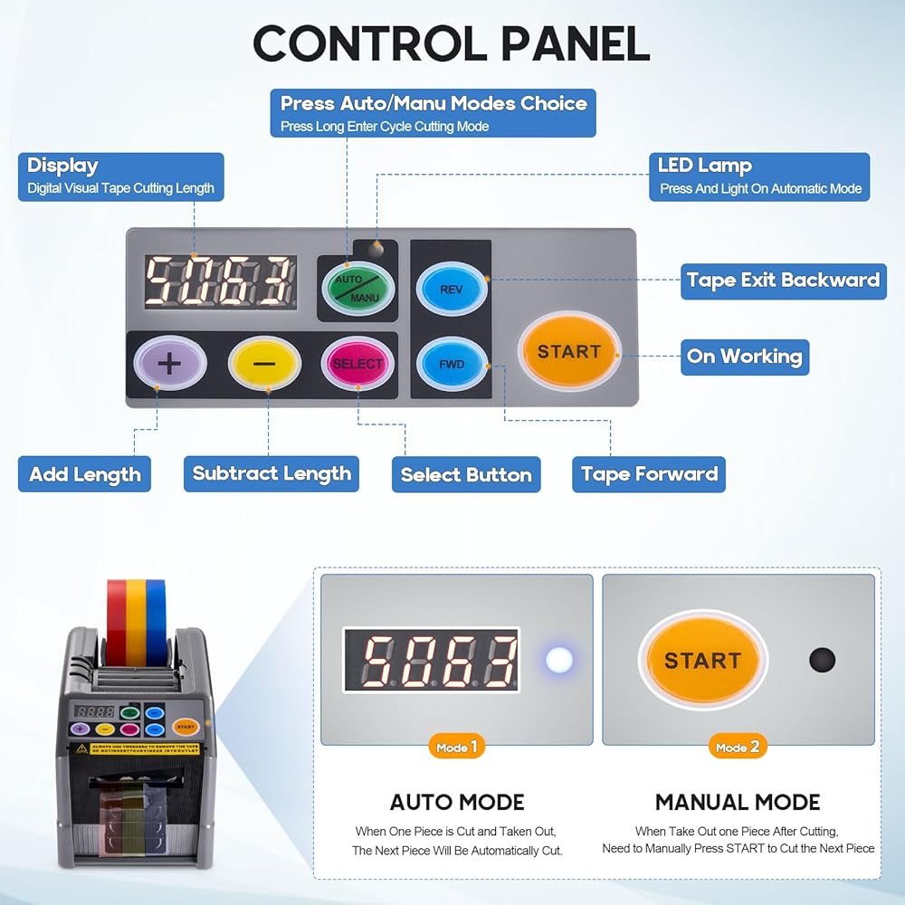 • عملية بسيطة: تحتوي آلة توزيع الأشرطة Yosuny على شاشة LED لإجراء قياسات دقيقة مع 12 خيار طول محدد مسبقًا ABCDEFHNORUY، ويمكنها قطع الشريط بدقة في الوضع التلقائي باستخدام مستشعر ذكي. اضغط على الزر AUTO/MANU، وسيومض مؤشر LED. سيتم قطع القطعة الثانية بعد إزالة الأولى. في الوضع اليدوي، اضغط على زر البداية في كل مرة. تنقل آلة قطع الشريط هذه عملك إلى المستوى التالي وتوفر الوقت والطاقة.
