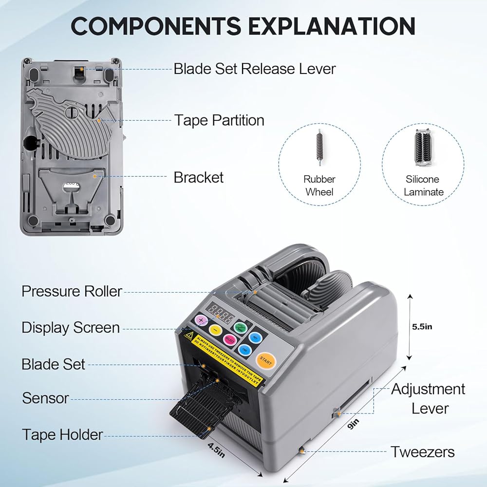• ترقية عجلة السيليكون: قاطع موزع الشريط الأوتوماتيكي ينطبق على عرض 6-60 مم/0.24 بوصة - 2.36 بوصة وطول 5-999 مم/0.2 بوصة - 39.33 بوصة. يمكن لعجلة السيليكون المطورة أن تقلل من بقايا المادة اللاصقة والتشويش إذا أصبحت لزجة. لا تحتاج مجموعة الشفرات المتينة إلى الاستبدال طالما يتم تنظيف المادة اللاصقة المتبقية بانتظام، وهو أمر مريح ويحسن كفاءة القطع والأداء.
