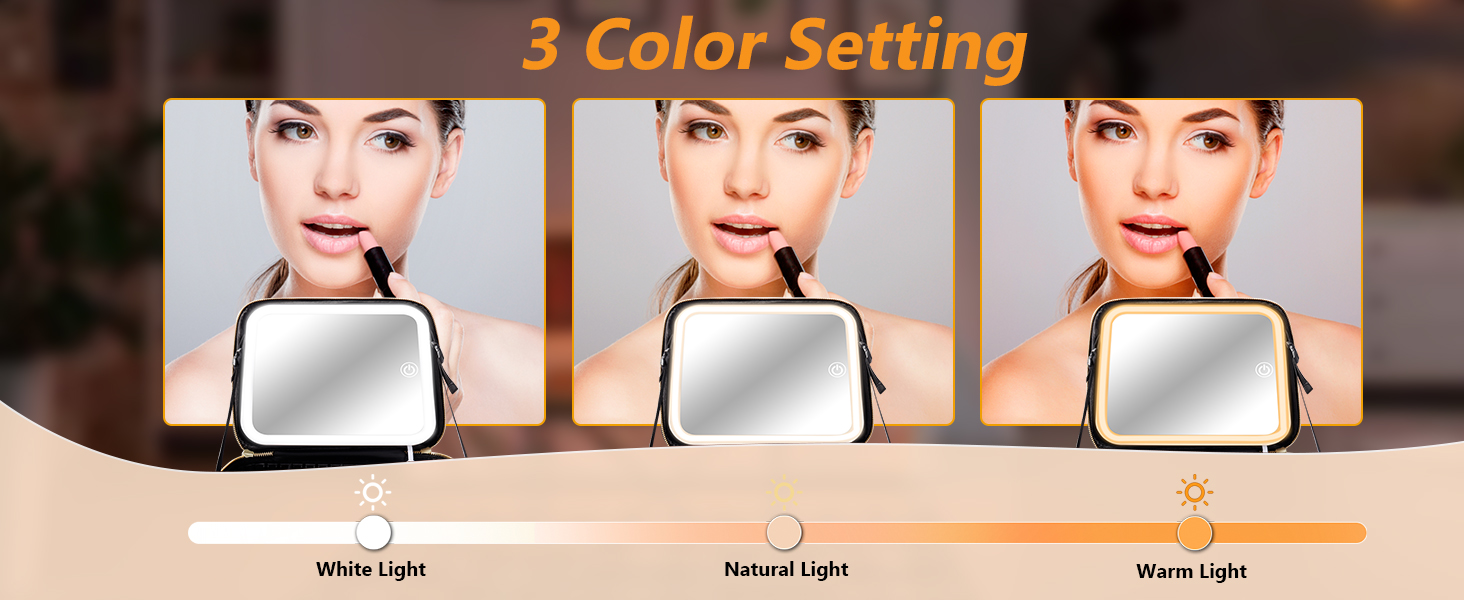 【3 أوضاع إضاءة ملونة】مرآة إضاءة كاملة الشاشة (9.05 × 8.26 بوصة) تحتوي على ثلاثة أوضاع إضاءة ملونة، مفتاح اللمس يسمح لك بالتبديل بين الإضاءة الباردة والطبيعية والدافئة. اضغط لفترة طويلة على المفتاح لضبط سطوع الضوء من 0% إلى 100%، مما يبرز حالة بشرتك وتفاصيل وجهك، ويساعدك على الحصول على مظهر مكياج مثالي.
