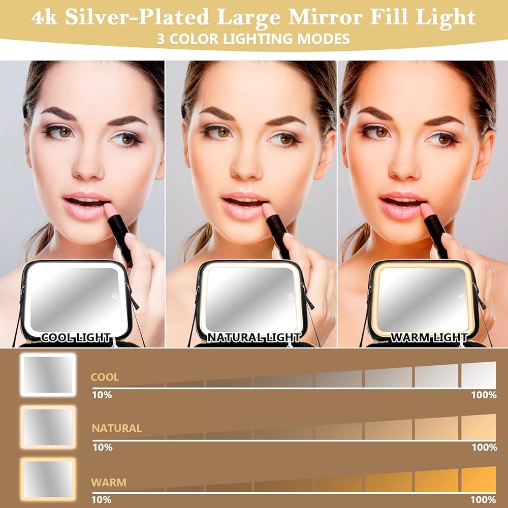 【حافظ على مكياج رائع في جميع الأوقات】خزانة ملابس ميليشو المحمولة - تلبي جميع احتياجات المكياج الخاصة بك. مرآة مستحضرات تجميل مطلية بالفضة 4K مع 3 أوضاع إضاءة قابلة للتعديل. سعة كبيرة لتخزين مستحضرات التجميل ولوحة تخزين فرش المكياج. يمكنك وضع مكياجك بشكل مريح سواء كنت في رحلة عمل أو مسافرة